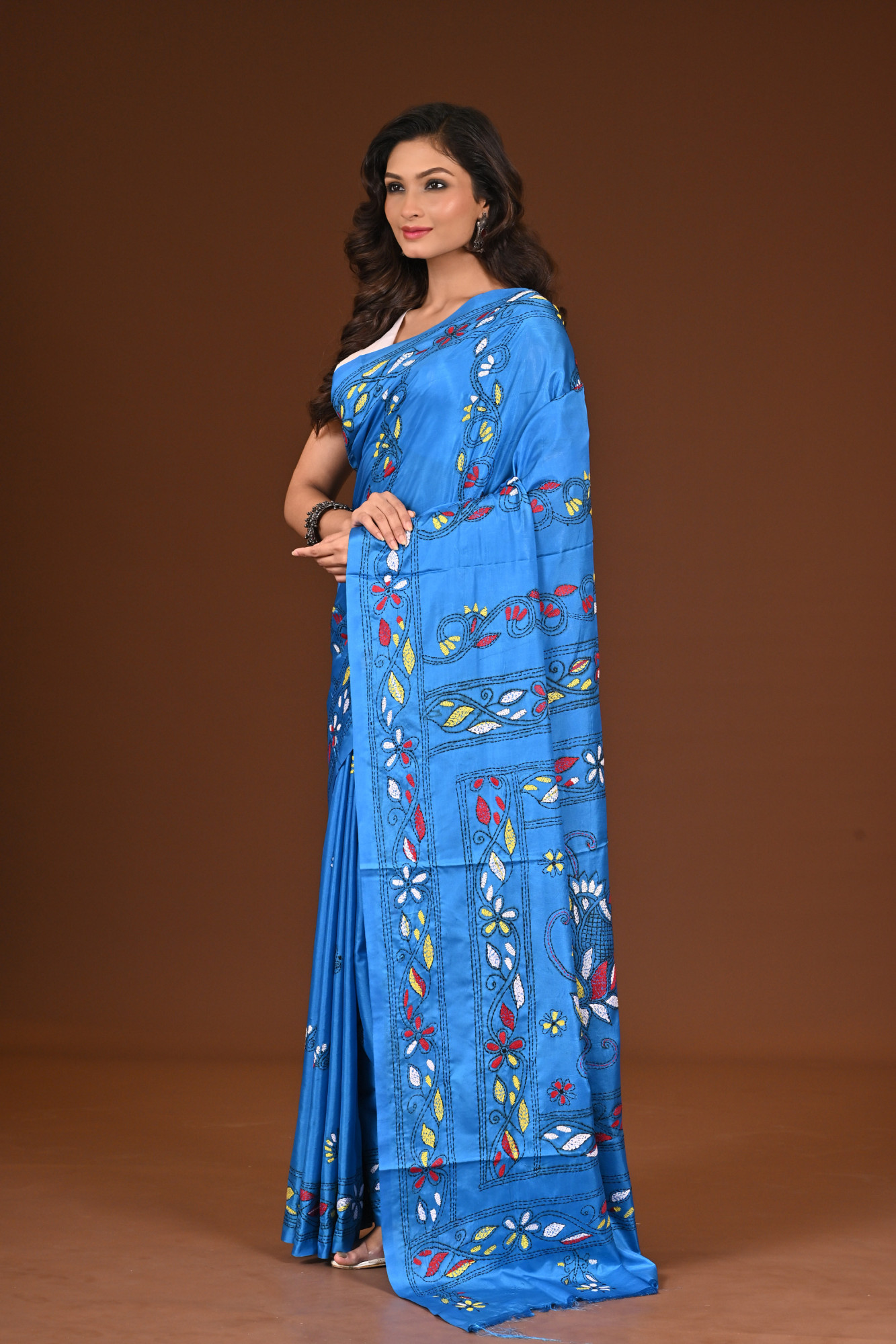 Zari : A blended silk Kantha saree is a traditional Indian saree crafted from a mix of silk and other fibers, adorned with Kantha embroidery—a hand-stitched technique originating from Bengal. These sarees are known for their lightweight drape, smooth texture, and intricate, often storytelling motifs stitched in fine running stitches. The blend of silk gives it a soft sheen and elegance, making it a perfect choice for both festive and casual occasions.
