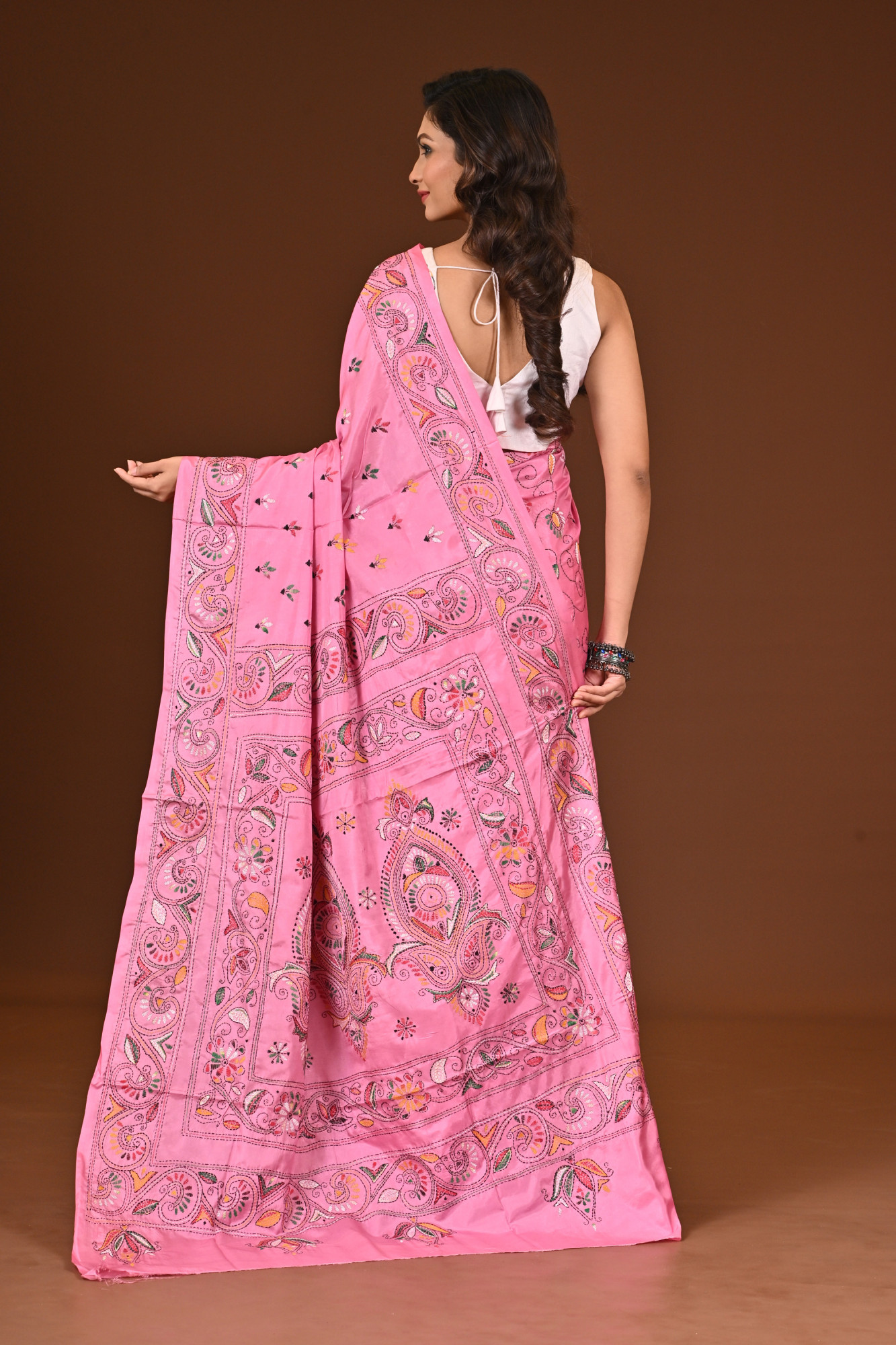Zari : A blended silk Kantha saree is a traditional Indian saree crafted from a mix of silk and other fibers, adorned with Kantha embroidery—a hand-stitched technique originating from Bengal. These sarees are known for their lightweight drape, smooth texture, and intricate, often storytelling motifs stitched in fine running stitches. The blend of silk gives it a soft sheen and elegance, making it a perfect choice for both festive and casual occasions.