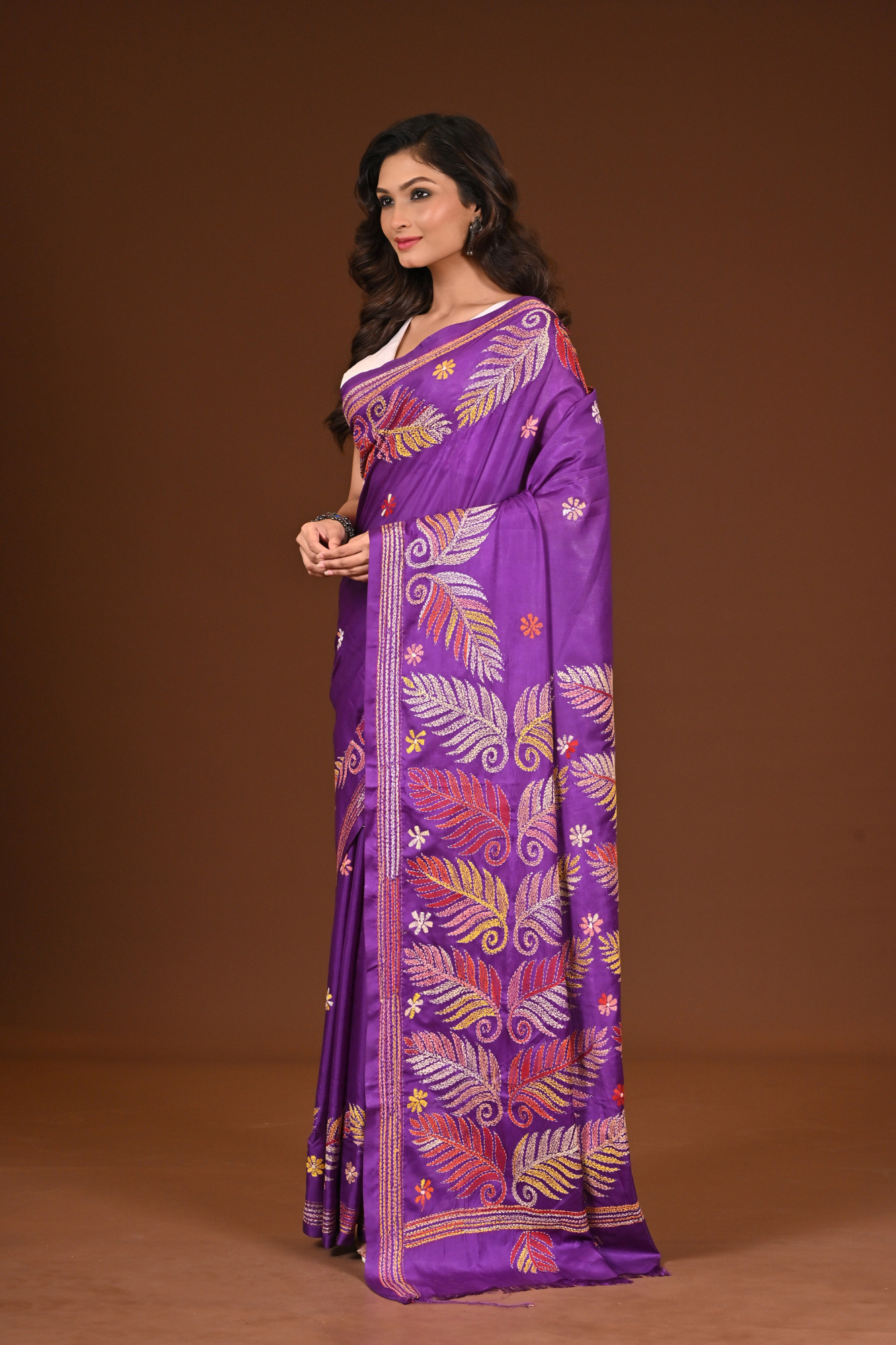 Zari : A blended silk Kantha saree is a traditional Indian saree crafted from a mix of silk and other fibers, adorned with Kantha embroidery—a hand-stitched technique originating from Bengal. These sarees are known for their lightweight drape, smooth texture, and intricate, often storytelling motifs stitched in fine running stitches. The blend of silk gives it a soft sheen and elegance, making it a perfect choice for both festive and casual occasions.