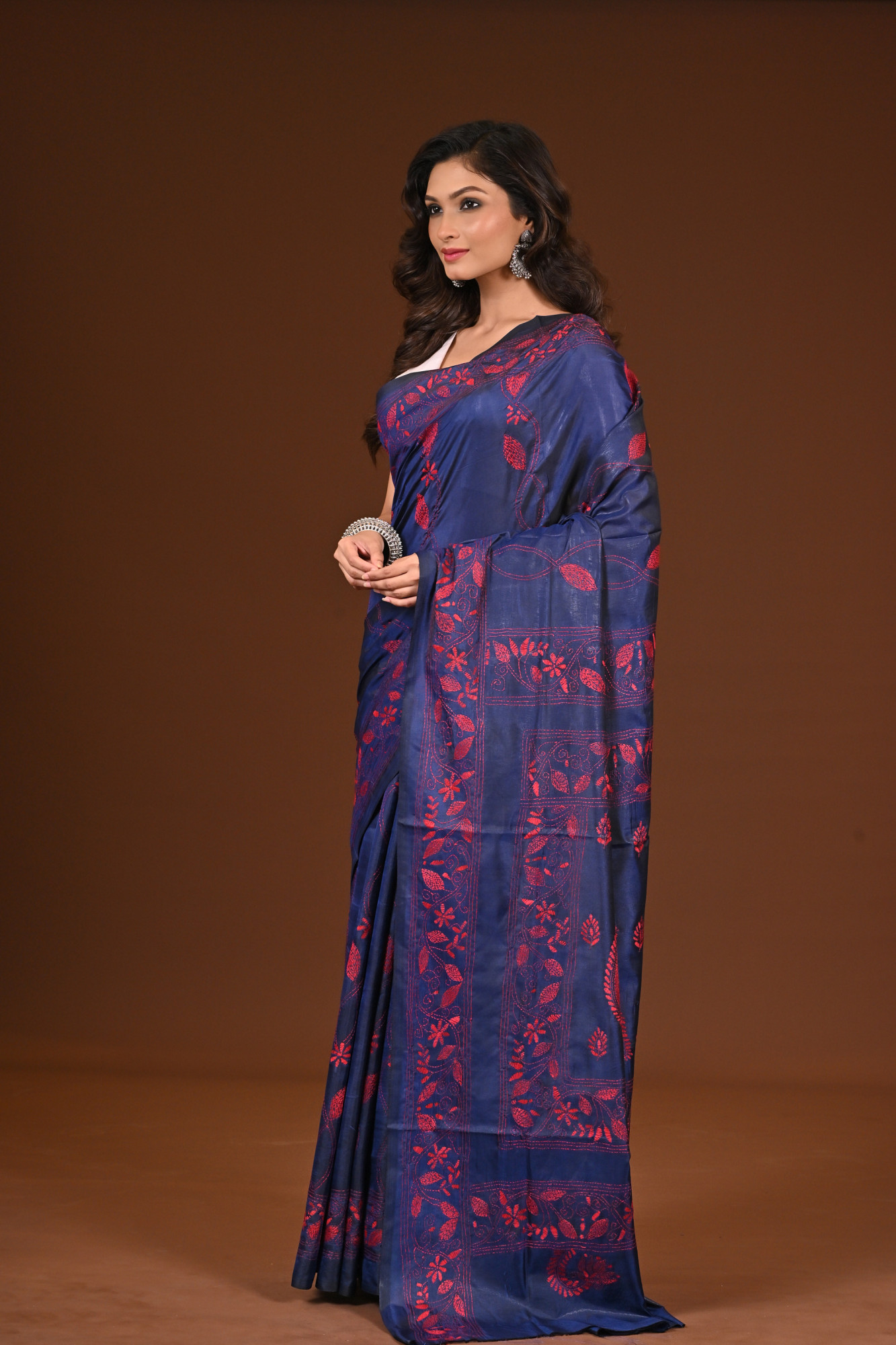 Zari : A blended silk Kantha saree is a traditional Indian saree crafted from a mix of silk and other fibers, adorned with Kantha embroidery—a hand-stitched technique originating from Bengal. These sarees are known for their lightweight drape, smooth texture, and intricate, often storytelling motifs stitched in fine running stitches. The blend of silk gives it a soft sheen and elegance, making it a perfect choice for both festive and casual occasions.