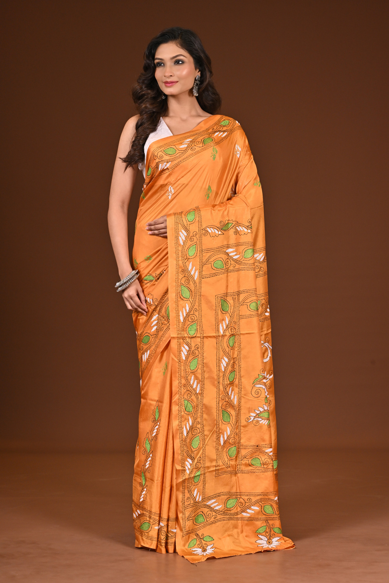 Zari : A blended silk Kantha saree is a traditional Indian saree crafted from a mix of silk and other fibers, adorned with Kantha embroidery—a hand-stitched technique originating from Bengal. These sarees are known for their lightweight drape, smooth texture, and intricate, often storytelling motifs stitched in fine running stitches. The blend of silk gives it a soft sheen and elegance, making it a perfect choice for both festive and casual occasions.