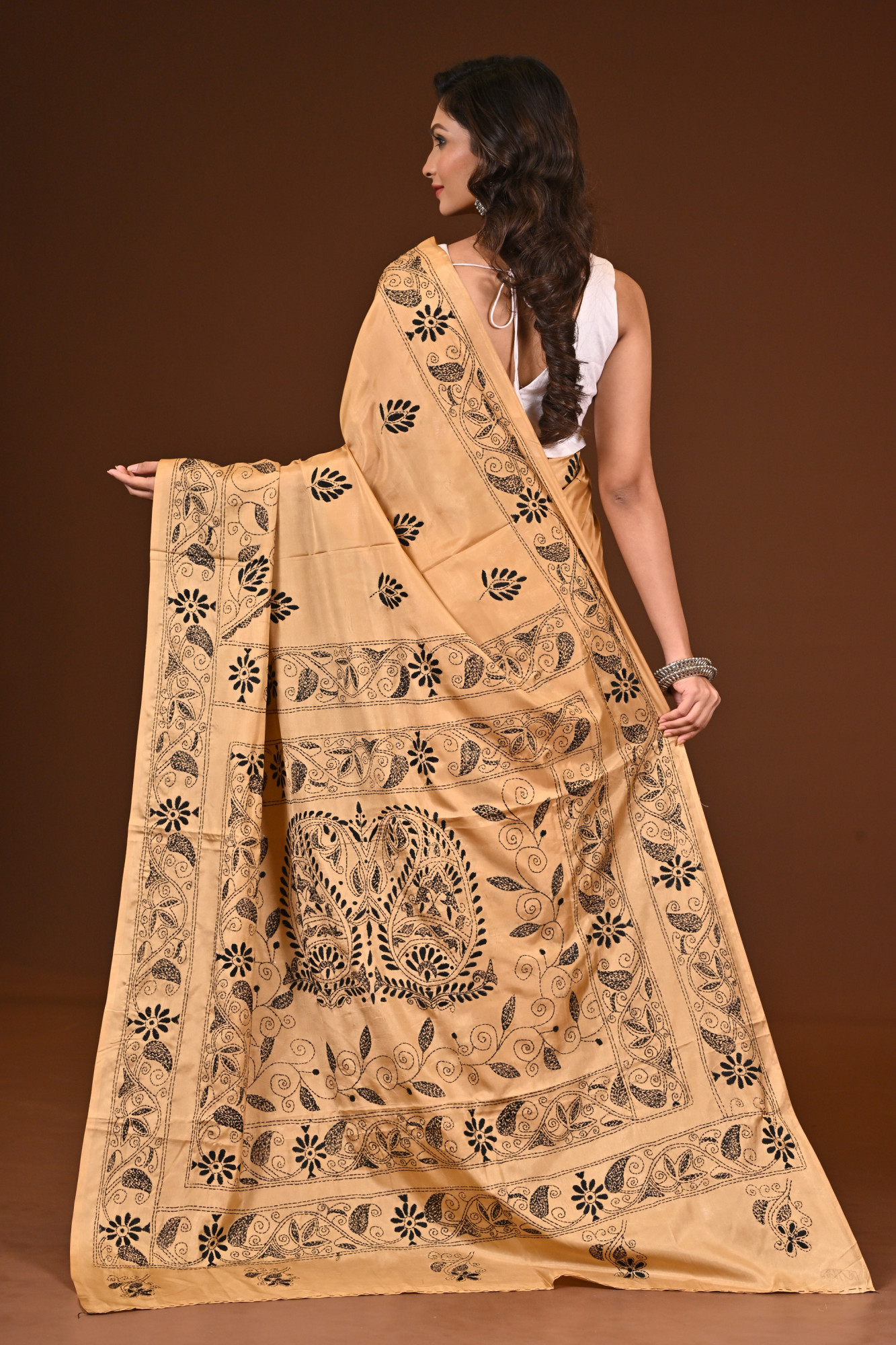 Zari : A blended silk Kantha saree is a traditional Indian saree crafted from a mix of silk and other fibers, adorned with Kantha embroidery—a hand-stitched technique originating from Bengal. These sarees are known for their lightweight drape, smooth texture, and intricate, often storytelling motifs stitched in fine running stitches. The blend of silk gives it a soft sheen and elegance, making it a perfect choice for both festive and casual occasions.