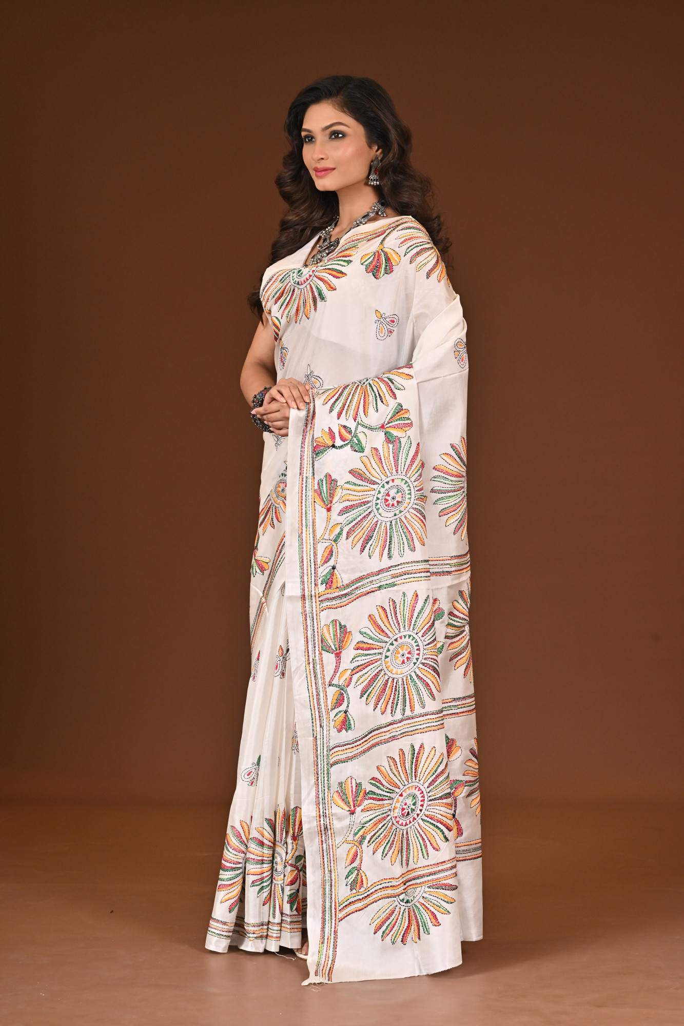 Zari : A blended silk Kantha saree is a traditional Indian saree crafted from a mix of silk and other fibers, adorned with Kantha embroidery—a hand-stitched technique originating from Bengal. These sarees are known for their lightweight drape, smooth texture, and intricate, often storytelling motifs stitched in fine running stitches. The blend of silk gives it a soft sheen and elegance, making it a perfect choice for both festive and casual occasions.