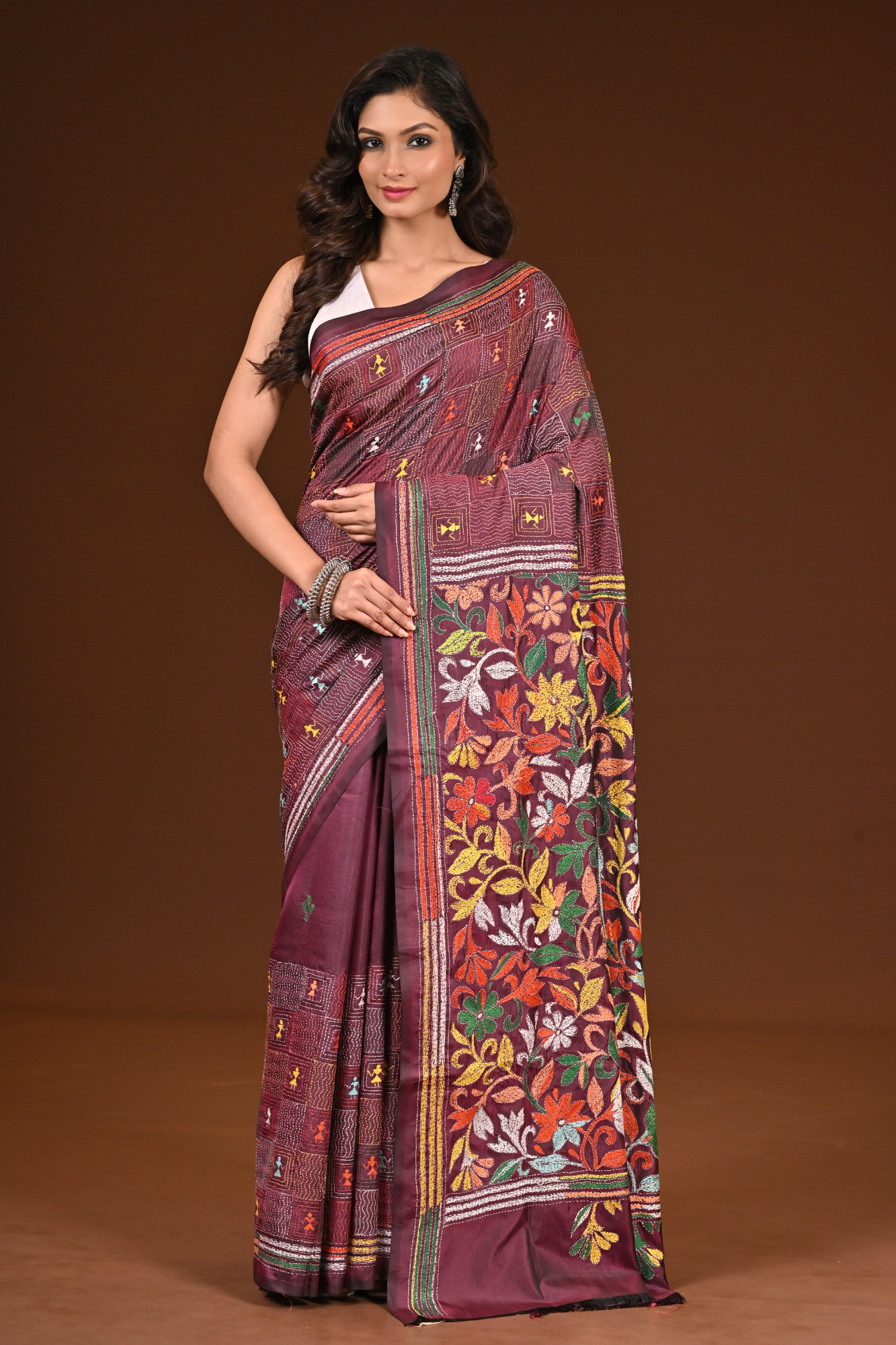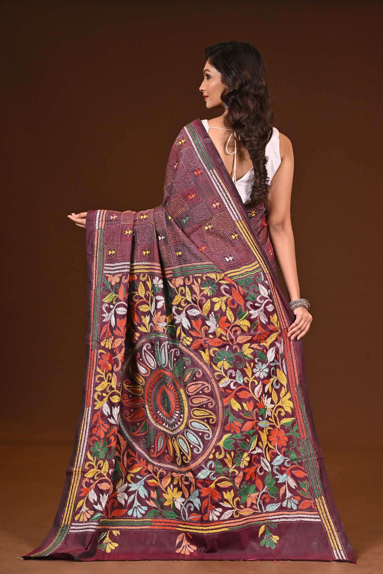 Material : Blended Silk Zari : A blended silk Kantha saree is a traditional Indian saree crafted from a mix of silk and other fibers, adorned with Kantha embroidery—a hand-stitched technique originating from Bengal. These sarees are known for their lightweight drape, smooth texture, and intricate, often storytelling motifs stitched in fine running stitches. The blend of silk gives it a soft sheen and elegance, making it a perfect choice for both festive and casual occasions. Inclusion : Comes with a matching blouse piece measuring 100 centimeters. Blouse worn by the model is not included.