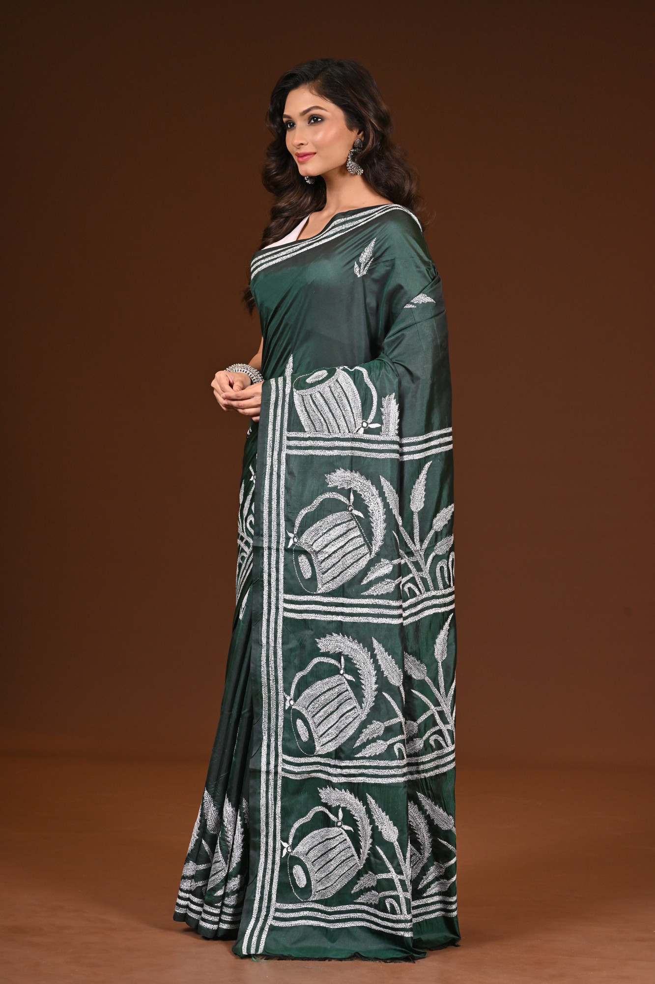 Material : Blended Silk Zari : A blended silk Kantha saree is a traditional Indian saree crafted from a mix of silk and other fibers, adorned with Kantha embroidery—a hand-stitched technique originating from Bengal. These sarees are known for their lightweight drape, smooth texture, and intricate, often storytelling motifs stitched in fine running stitches. The blend of silk gives it a soft sheen and elegance, making it a perfect choice for both festive and casual occasions. Inclusion : Comes with a matching blouse piece measuring 100 centimeters. Blouse worn by the model is not included.