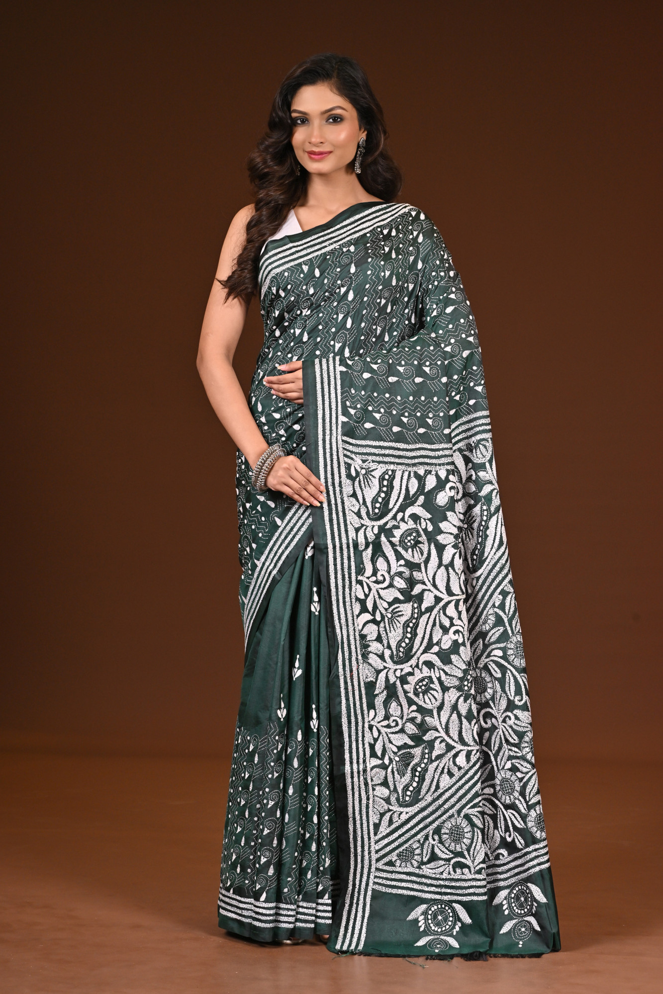 Material : Blended Silk Zari : A blended silk Kantha saree is a traditional Indian saree crafted from a mix of silk and other fibers, adorned with Kantha embroidery—a hand-stitched technique originating from Bengal. These sarees are known for their lightweight drape, smooth texture, and intricate, often storytelling motifs stitched in fine running stitches. The blend of silk gives it a soft sheen and elegance, making it a perfect choice for both festive and casual occasions. Inclusion : Comes with a matching blouse piece measuring 100 centimeters. Blouse worn by the model is not included.