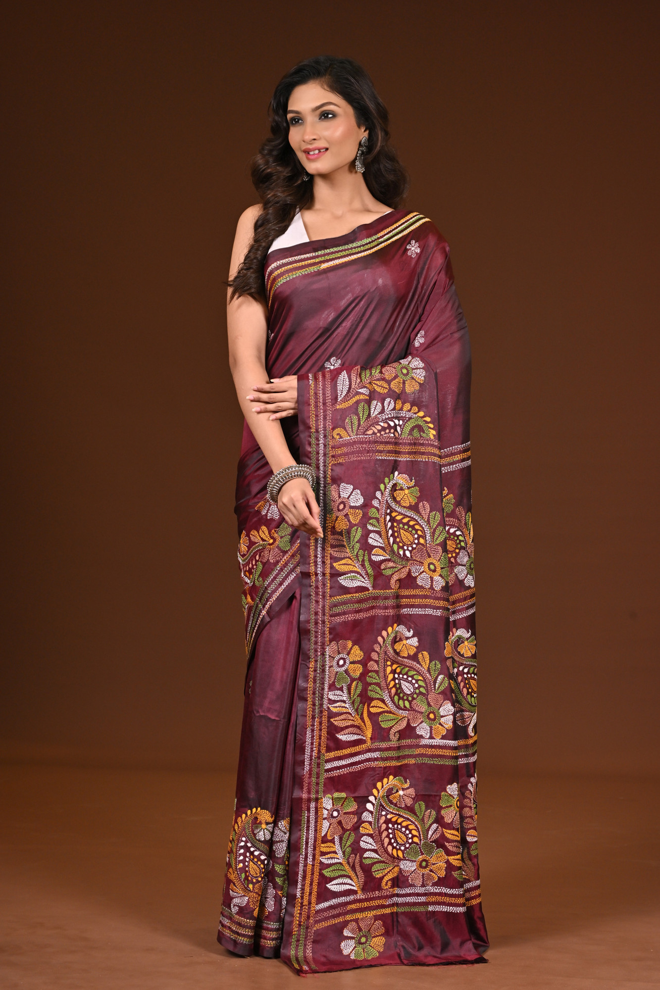 Material : Blended Silk Zari : A blended silk Kantha saree is a traditional Indian saree crafted from a mix of silk and other fibers, adorned with Kantha embroidery—a hand-stitched technique originating from Bengal. These sarees are known for their lightweight drape, smooth texture, and intricate, often storytelling motifs stitched in fine running stitches. The blend of silk gives it a soft sheen and elegance, making it a perfect choice for both festive and casual occasions. Inclusion : Comes with a matching blouse piece measuring 100 centimeters. Blouse worn by the model is not included.