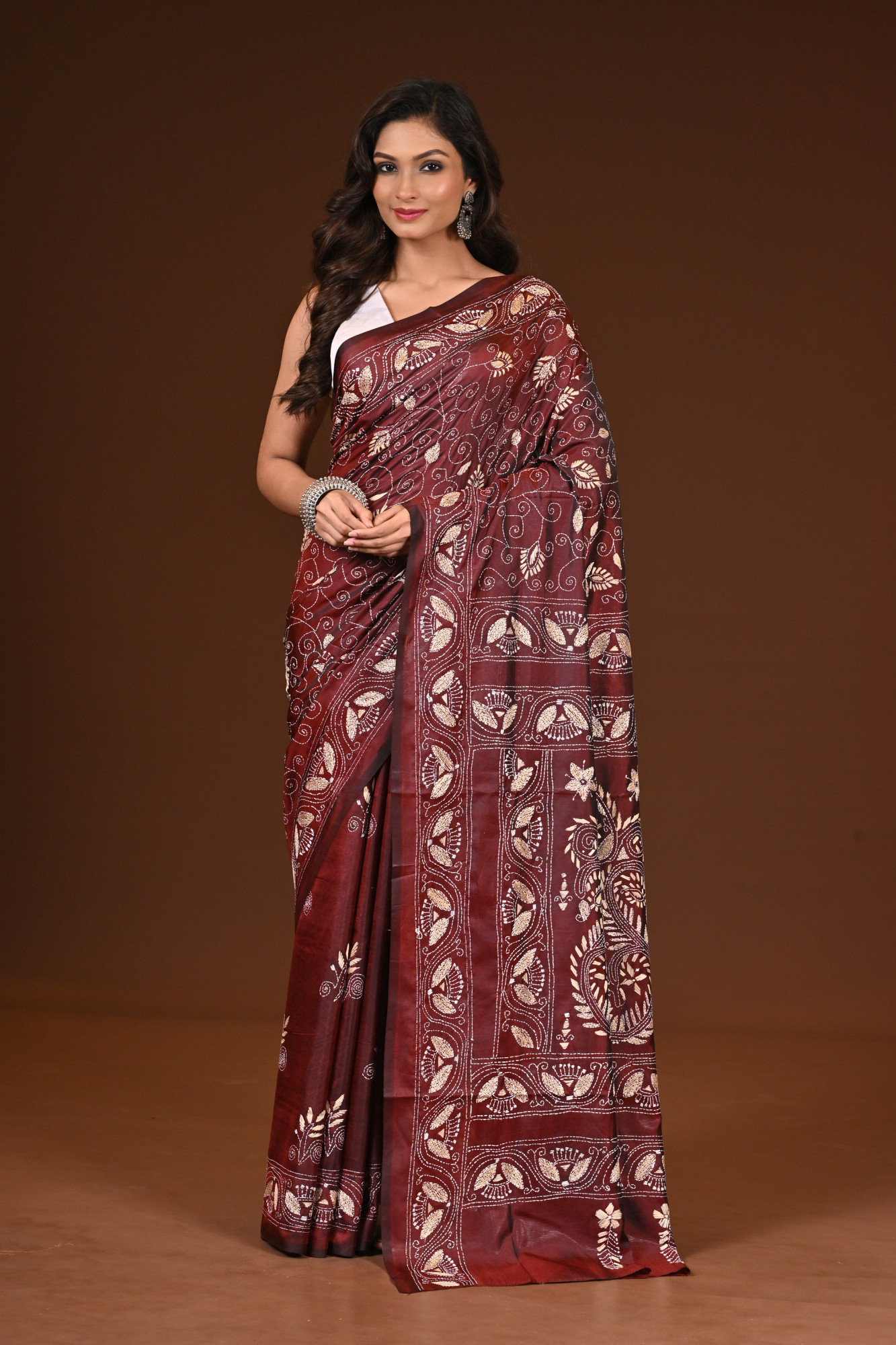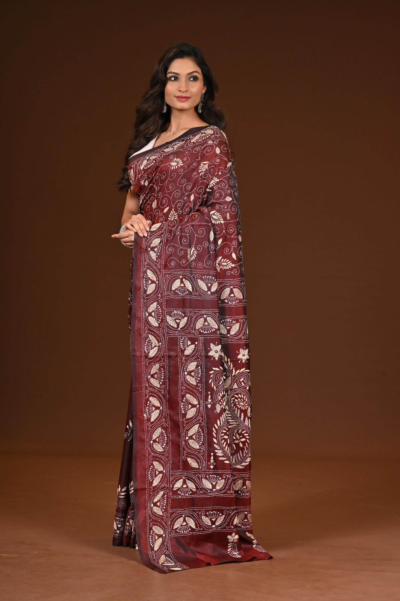 Material : Blended Silk Zari : A blended silk Kantha saree is a traditional Indian saree crafted from a mix of silk and other fibers, adorned with Kantha embroidery—a hand-stitched technique originating from Bengal. These sarees are known for their lightweight drape, smooth texture, and intricate, often storytelling motifs stitched in fine running stitches. The blend of silk gives it a soft sheen and elegance, making it a perfect choice for both festive and casual occasions. Inclusion : Comes with a matching blouse piece measuring 100 centimeters. Blouse worn by the model is not included.