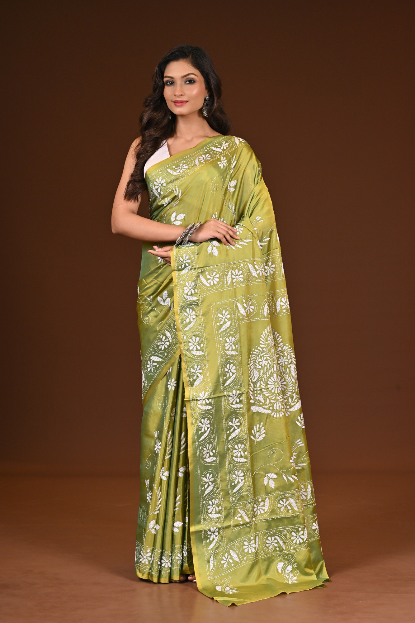 Material : Blended Silk Zari : A blended silk Kantha saree is a traditional Indian saree crafted from a mix of silk and other fibers, adorned with Kantha embroidery—a hand-stitched technique originating from Bengal. These sarees are known for their lightweight drape, smooth texture, and intricate, often storytelling motifs stitched in fine running stitches. The blend of silk gives it a soft sheen and elegance, making it a perfect choice for both festive and casual occasions. Inclusion : Comes with a matching blouse piece measuring 100 centimeters. Blouse worn by the model is not included.