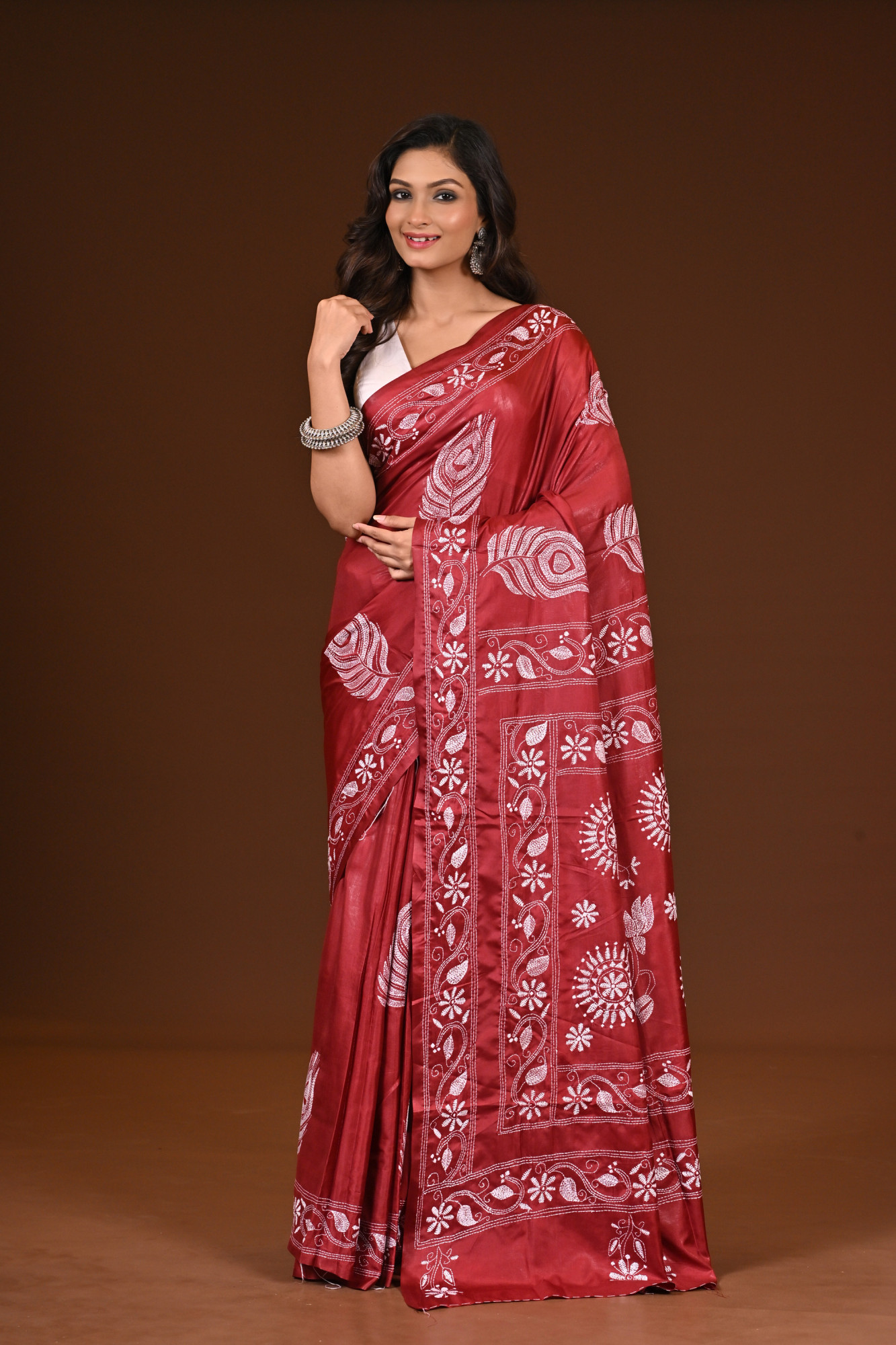 Material : Blended Silk Zari : A blended silk Kantha saree is a traditional Indian saree crafted from a mix of silk and other fibers, adorned with Kantha embroidery—a hand-stitched technique originating from Bengal. These sarees are known for their lightweight drape, smooth texture, and intricate, often storytelling motifs stitched in fine running stitches. The blend of silk gives it a soft sheen and elegance, making it a perfect choice for both festive and casual occasions. Inclusion : Comes with a matching blouse piece measuring 100 centimeters. Blouse worn by the model is not included.
