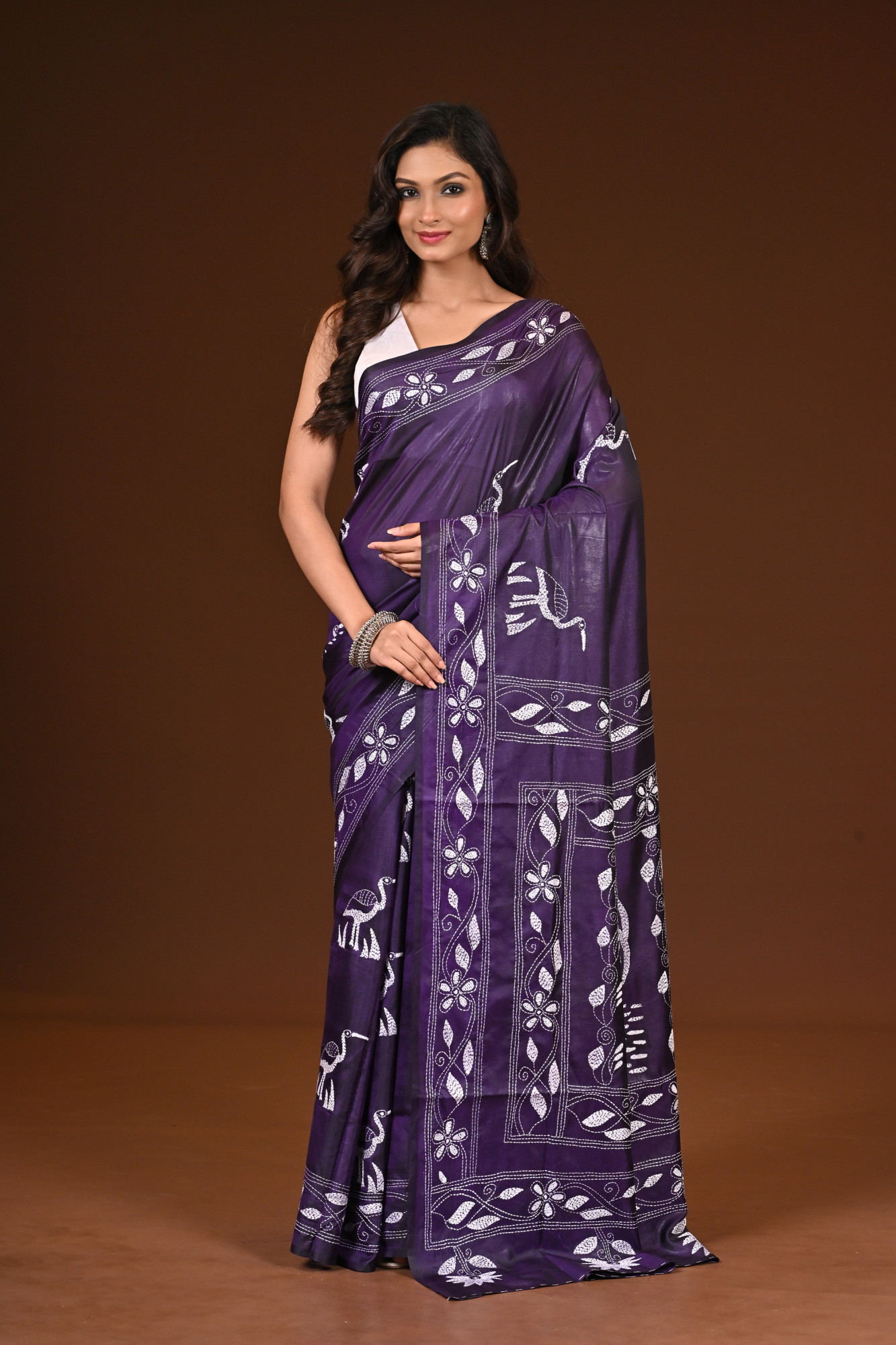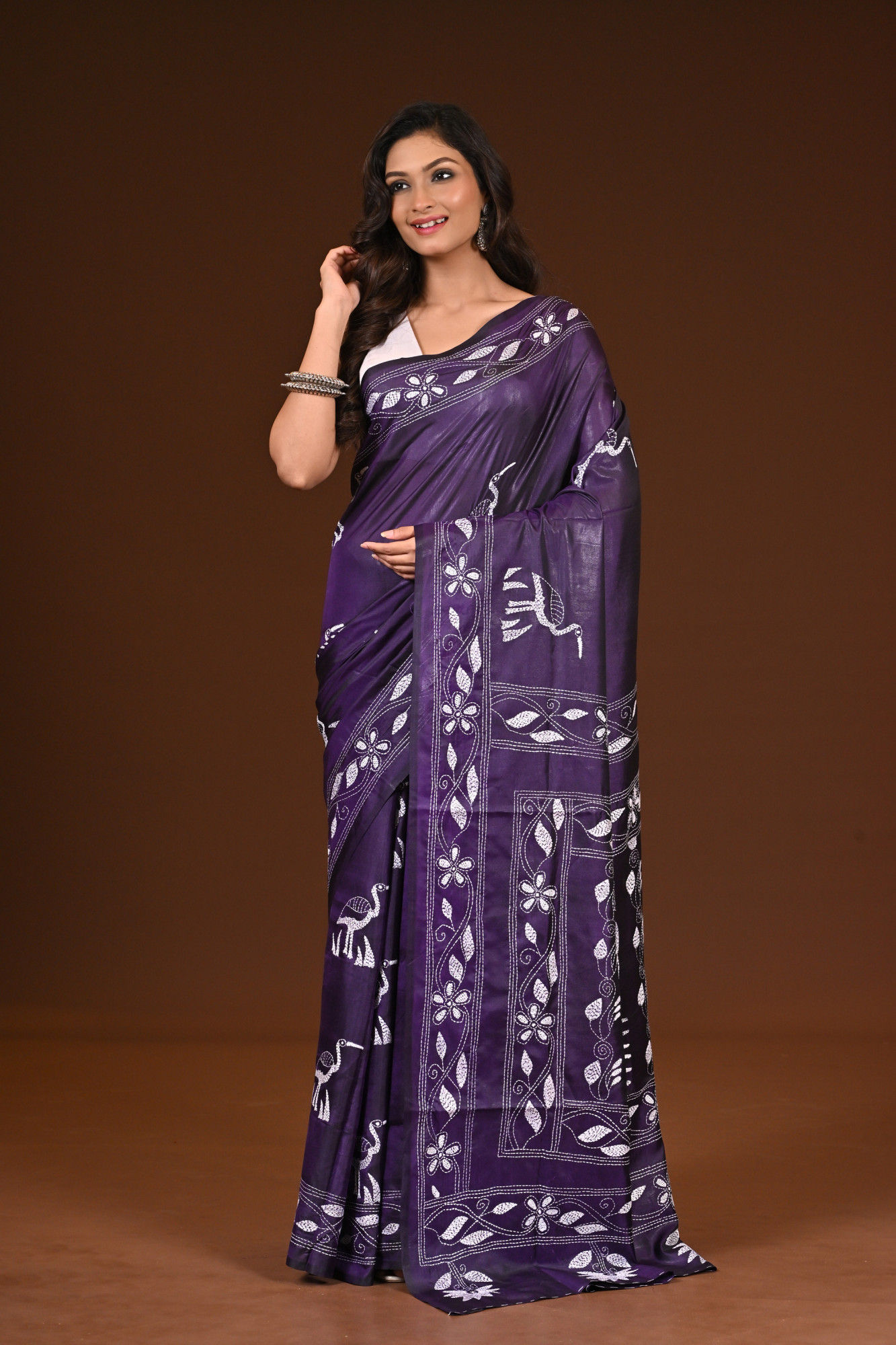 Material : Blended Silk Zari : A blended silk Kantha saree is a traditional Indian saree crafted from a mix of silk and other fibers, adorned with Kantha embroidery—a hand-stitched technique originating from Bengal. These sarees are known for their lightweight drape, smooth texture, and intricate, often storytelling motifs stitched in fine running stitches. The blend of silk gives it a soft sheen and elegance, making it a perfect choice for both festive and casual occasions. Inclusion : Comes with a matching blouse piece measuring 100 centimeters. Blouse worn by the model is not included.