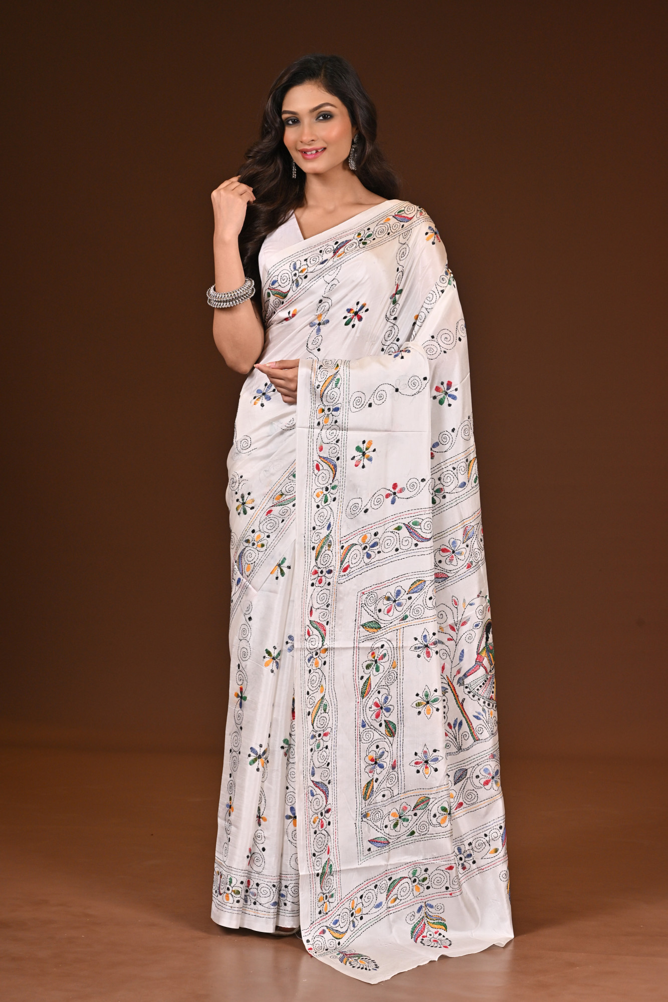 Material : Blended Silk Zari : A blended silk Kantha saree is a traditional Indian saree crafted from a mix of silk and other fibers, adorned with Kantha embroidery—a hand-stitched technique originating from Bengal. These sarees are known for their lightweight drape, smooth texture, and intricate, often storytelling motifs stitched in fine running stitches. The blend of silk gives it a soft sheen and elegance, making it a perfect choice for both festive and casual occasions. Inclusion : Comes with a matching blouse piece measuring 100 centimeters. Blouse worn by the model is not included.