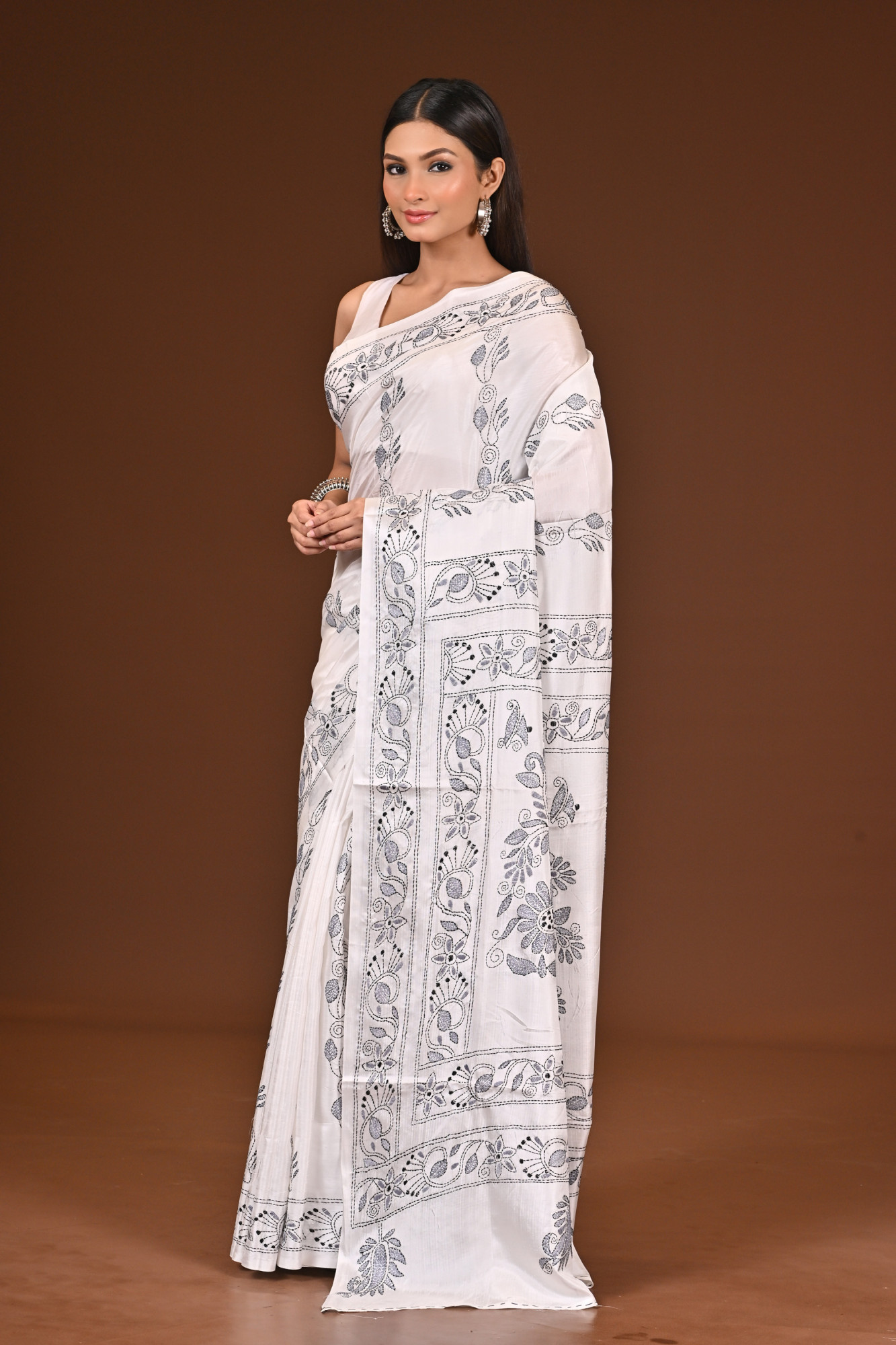 Material : Blended Silk Zari : A blended silk Kantha saree is a traditional Indian saree crafted from a mix of silk and other fibers, adorned with Kantha embroidery—a hand-stitched technique originating from Bengal. These sarees are known for their lightweight drape, smooth texture, and intricate, often storytelling motifs stitched in fine running stitches. The blend of silk gives it a soft sheen and elegance, making it a perfect choice for both festive and casual occasions. Inclusion : Comes with a matching blouse piece measuring 100 centimeters. Blouse worn by the model is not included.