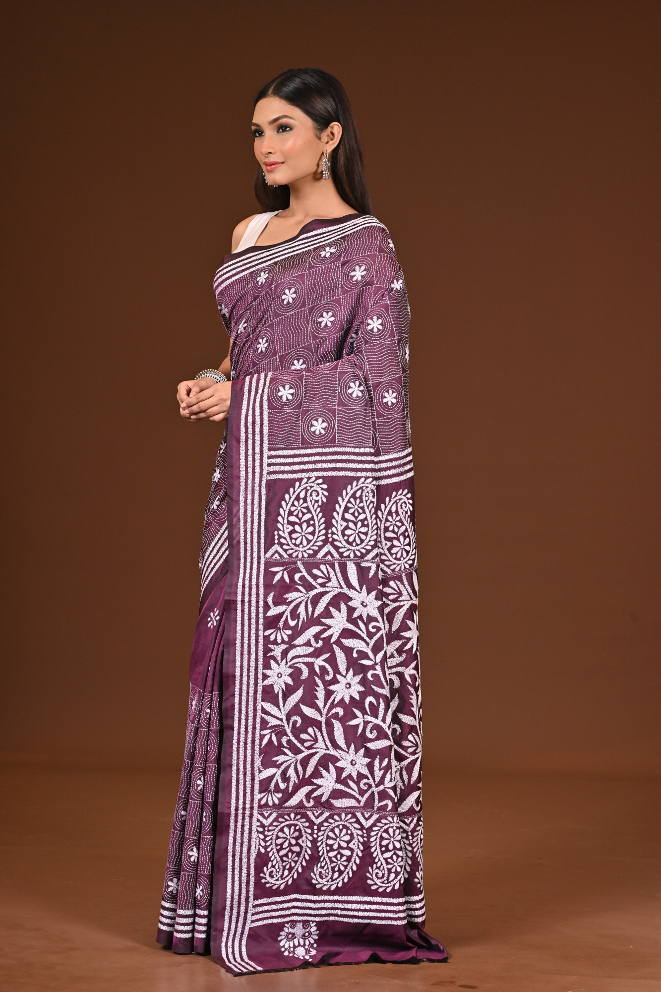 Material : Blended Silk Zari : A blended silk Kantha saree is a traditional Indian saree crafted from a mix of silk and other fibers, adorned with Kantha embroidery—a hand-stitched technique originating from Bengal. These sarees are known for their lightweight drape, smooth texture, and intricate, often storytelling motifs stitched in fine running stitches. The blend of silk gives it a soft sheen and elegance, making it a perfect choice for both festive and casual occasions. Inclusion : Comes with a matching blouse piece measuring 100 centimeters. Blouse worn by the model is not included.