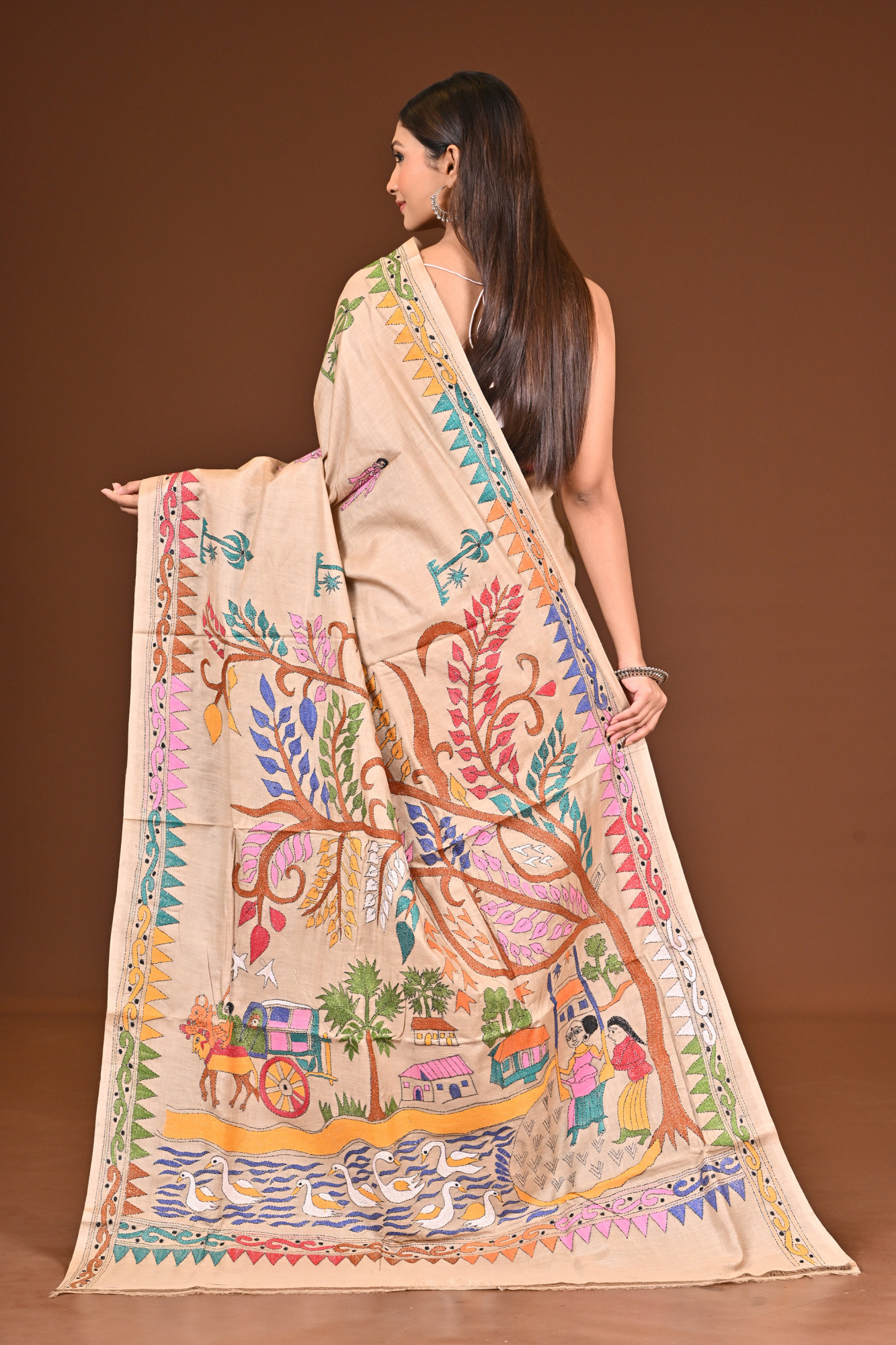Material : Gachi Silk Zari : A Gachi Silk Kantha Saree is a luxurious handwoven saree that combines Gachi silk, a type of raw silk known for its slightly coarse texture and natural sheen, with the intricate Kantha embroidery from Bengal. These sarees are known for their elegant drape and detailed, hand-stitched patterns that often depict floral, folk, or nature-inspired motifs. Perfect for festive and traditional occasions, Gachi Silk Kantha Sarees are a beautiful blend of rustic charm and artistic craftsmanship. Inclusion : Comes with a matching blouse piece measuring 100 centimeters. Blouse worn by the model is not included. Care Tips: Dry clean only to maintain embroidery and fabric texture. Store in a muslin cloth to avoid snagging. Iron on low heat from the reverse side. Avoid direct perfume contact with the embroidery. Refold occasionally to preserve fabric structure. Note: This is a handmade/ handwoven product. So, any minor inconsistency in weaving/ embroidery are natural and lend to the individuality of the product. Every possible care has been taken to give an accurate representation of the product. However minor variation occurs due to digital photography/ lighting/ brightness settings of mobile, tablet, laptop, etc. which is beyond our hands.