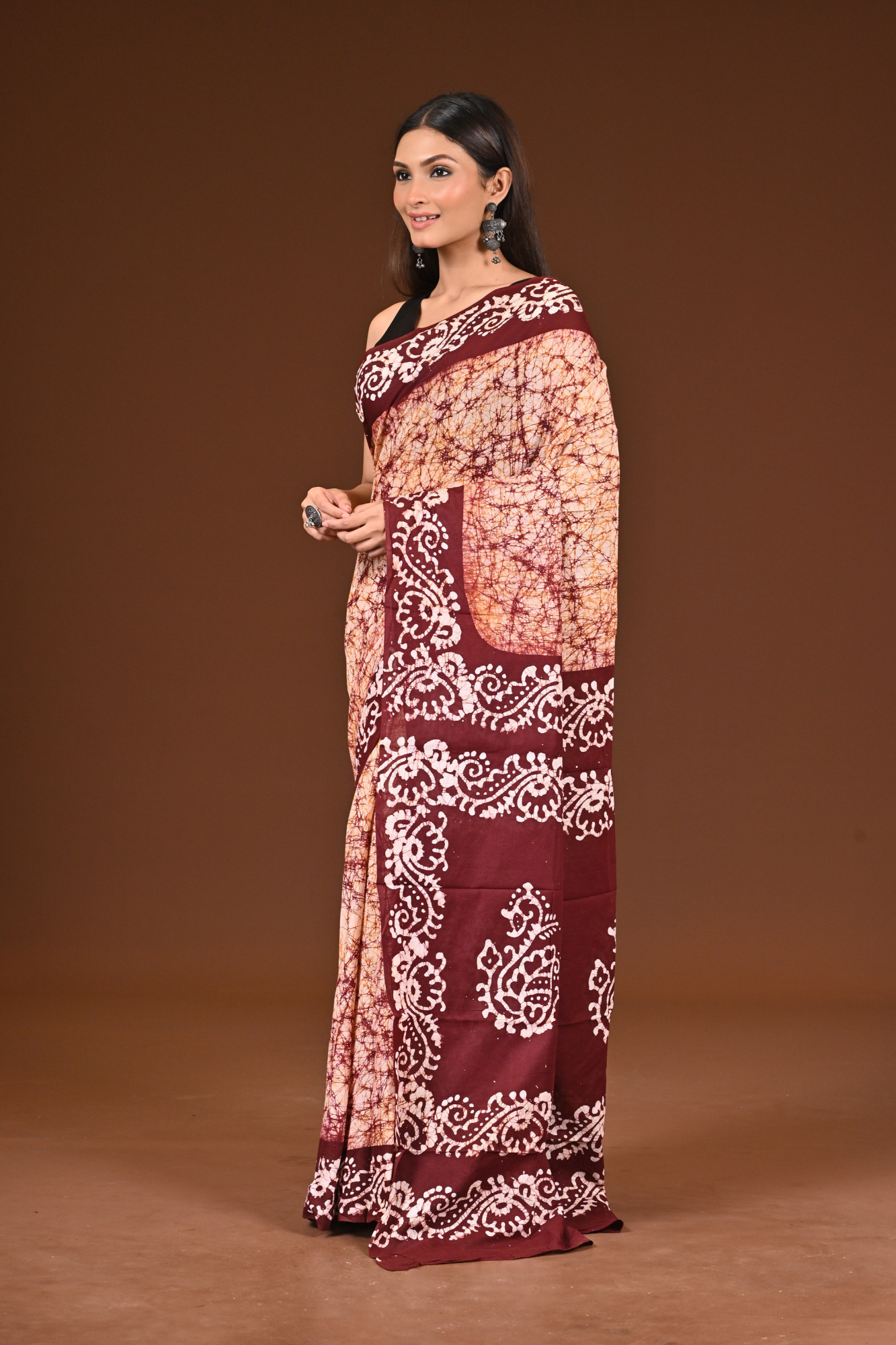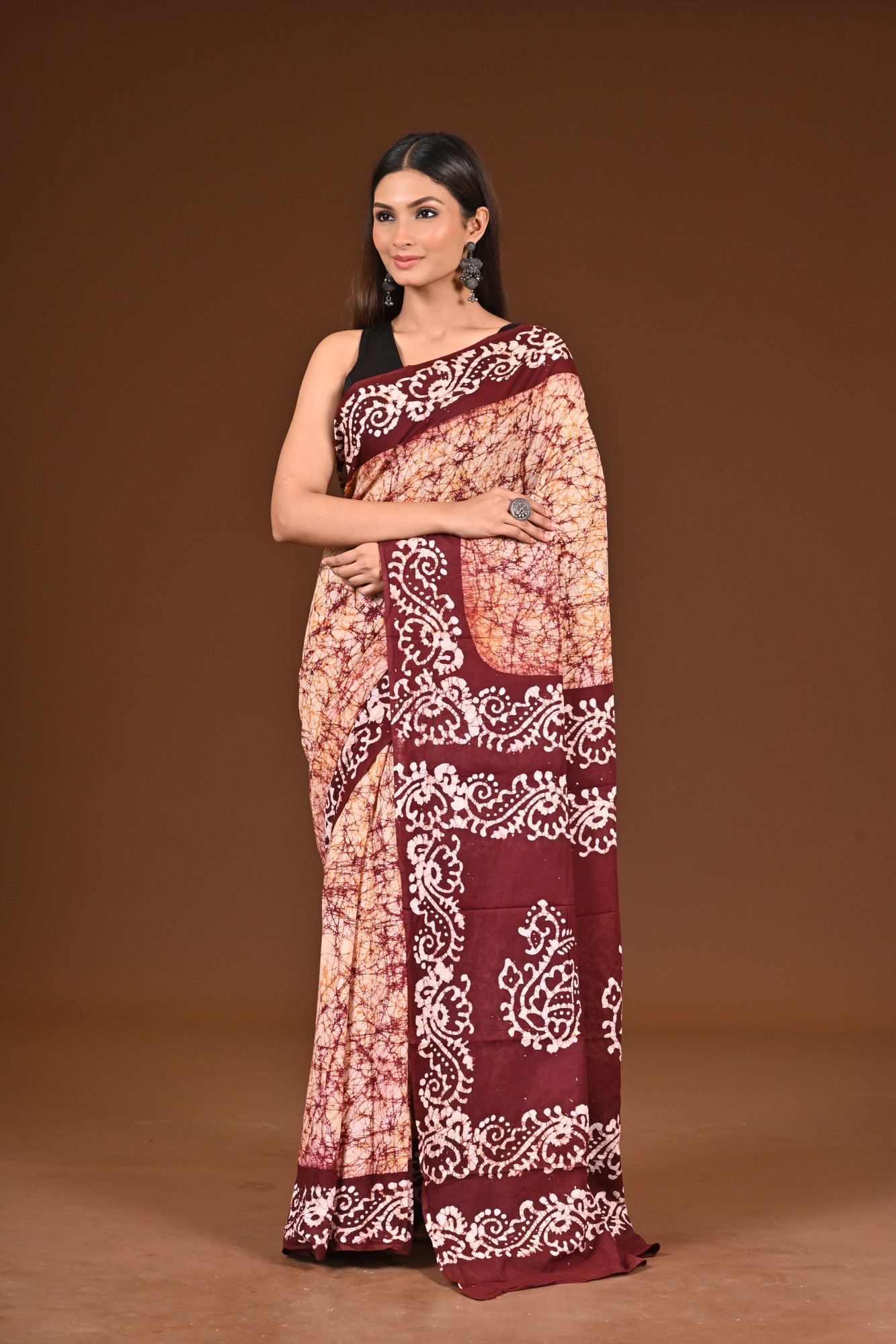 • Zari : A Cotton Hand batik Saree features breathable cotton fabric with traditional hand-dyed Batik patterns. It blends comfort with artistic, intricate designs for a stylish and distinctive appearance.
