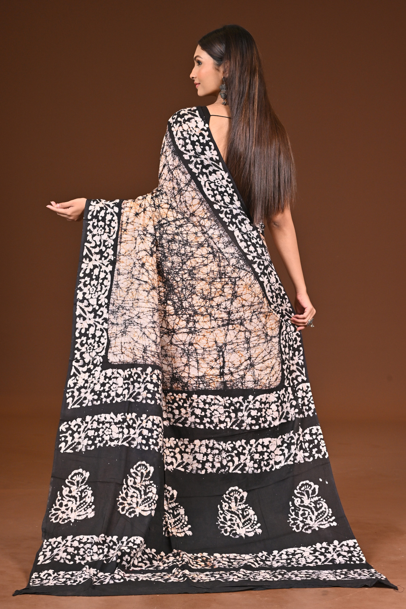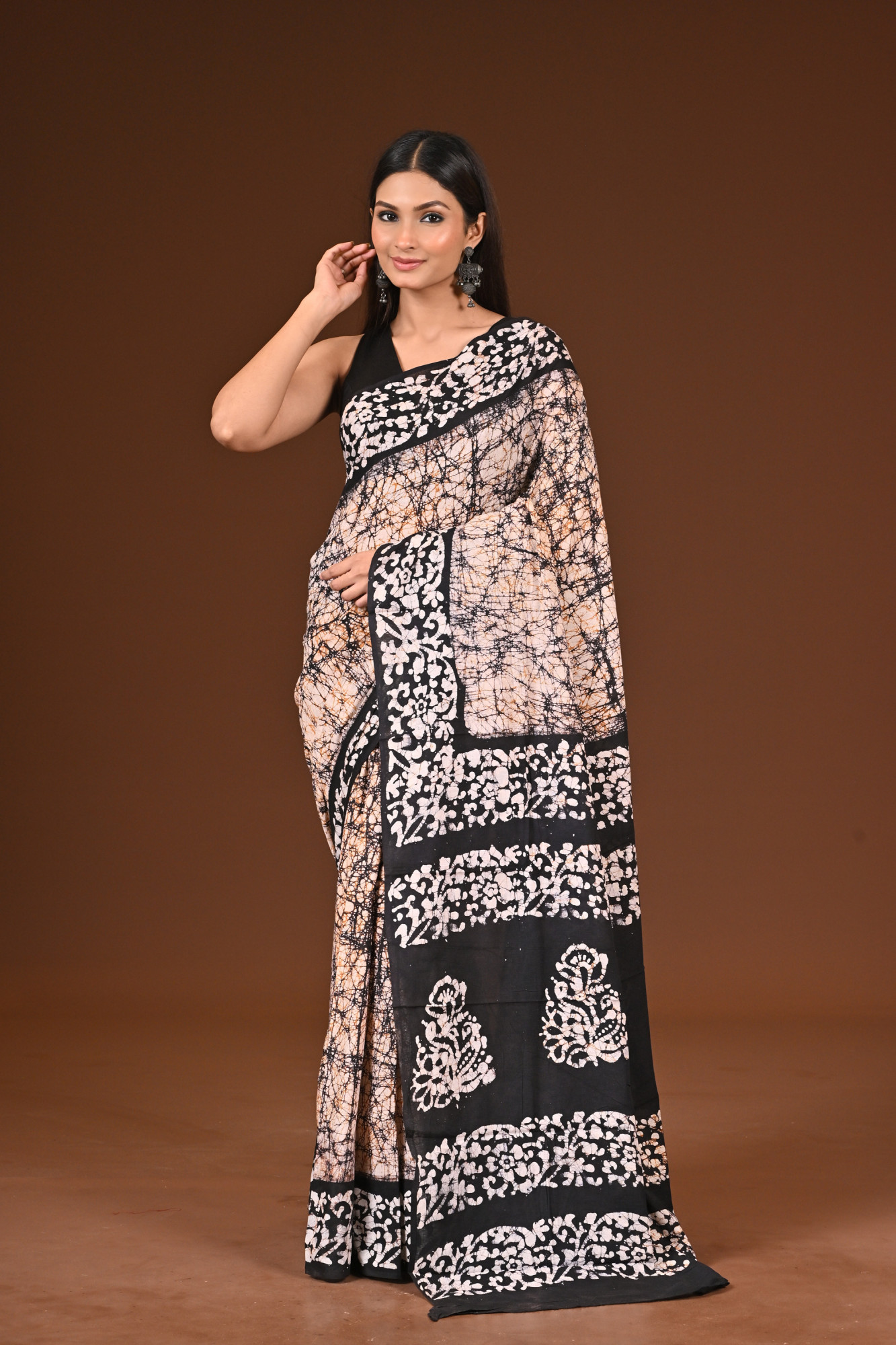 • Zari : A Cotton Hand batik Saree features breathable cotton fabric with traditional hand-dyed Batik patterns. It blends comfort with artistic, intricate designs for a stylish and distinctive appearance.