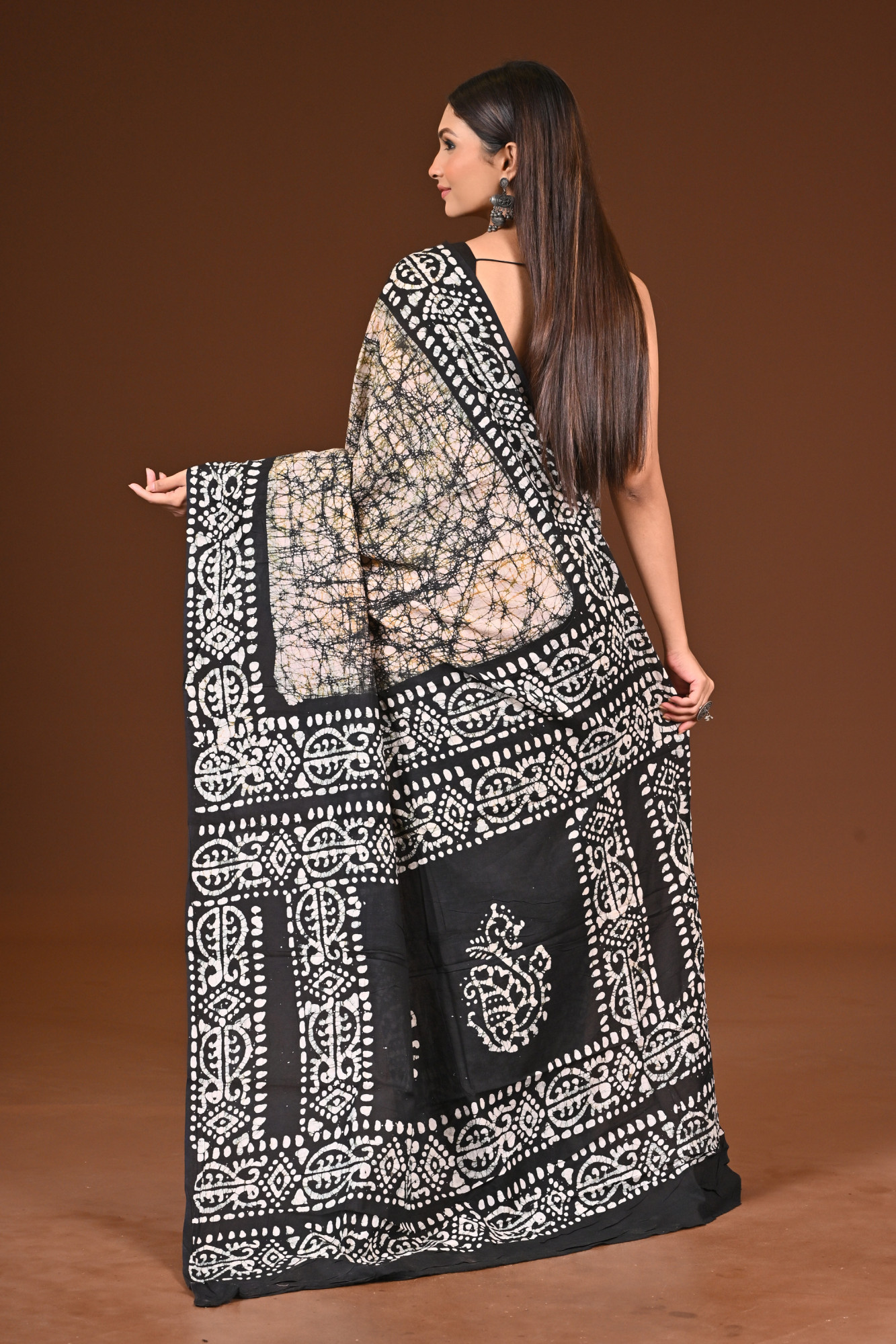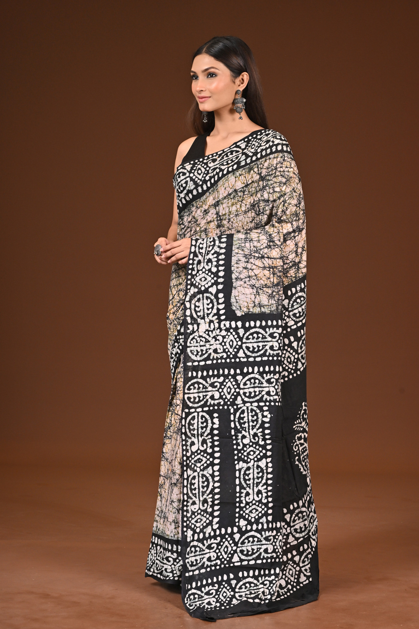 • Zari : A Cotton Hand batik Saree features breathable cotton fabric with traditional hand-dyed Batik patterns. It blends comfort with artistic, intricate designs for a stylish and distinctive appearance.