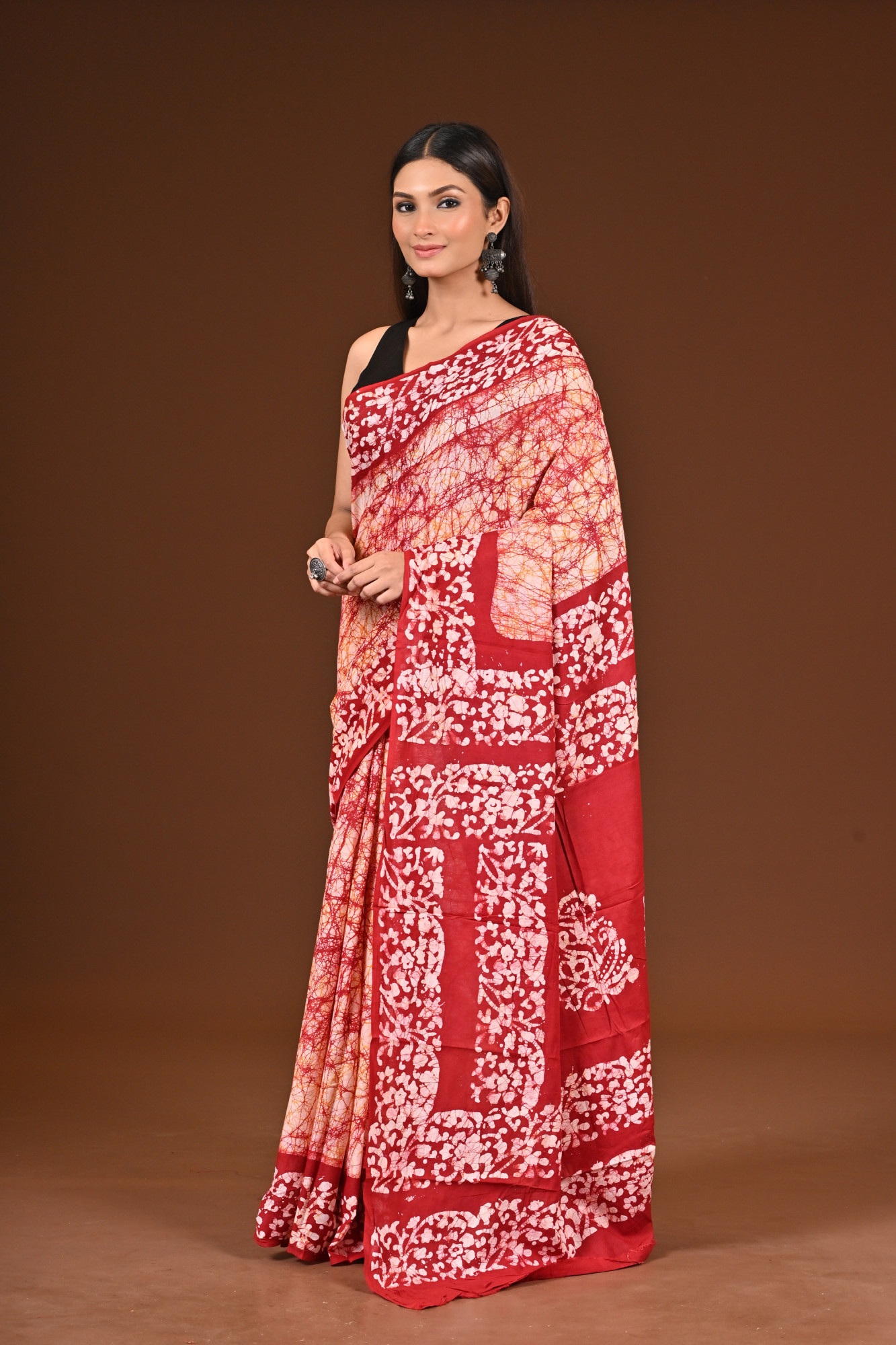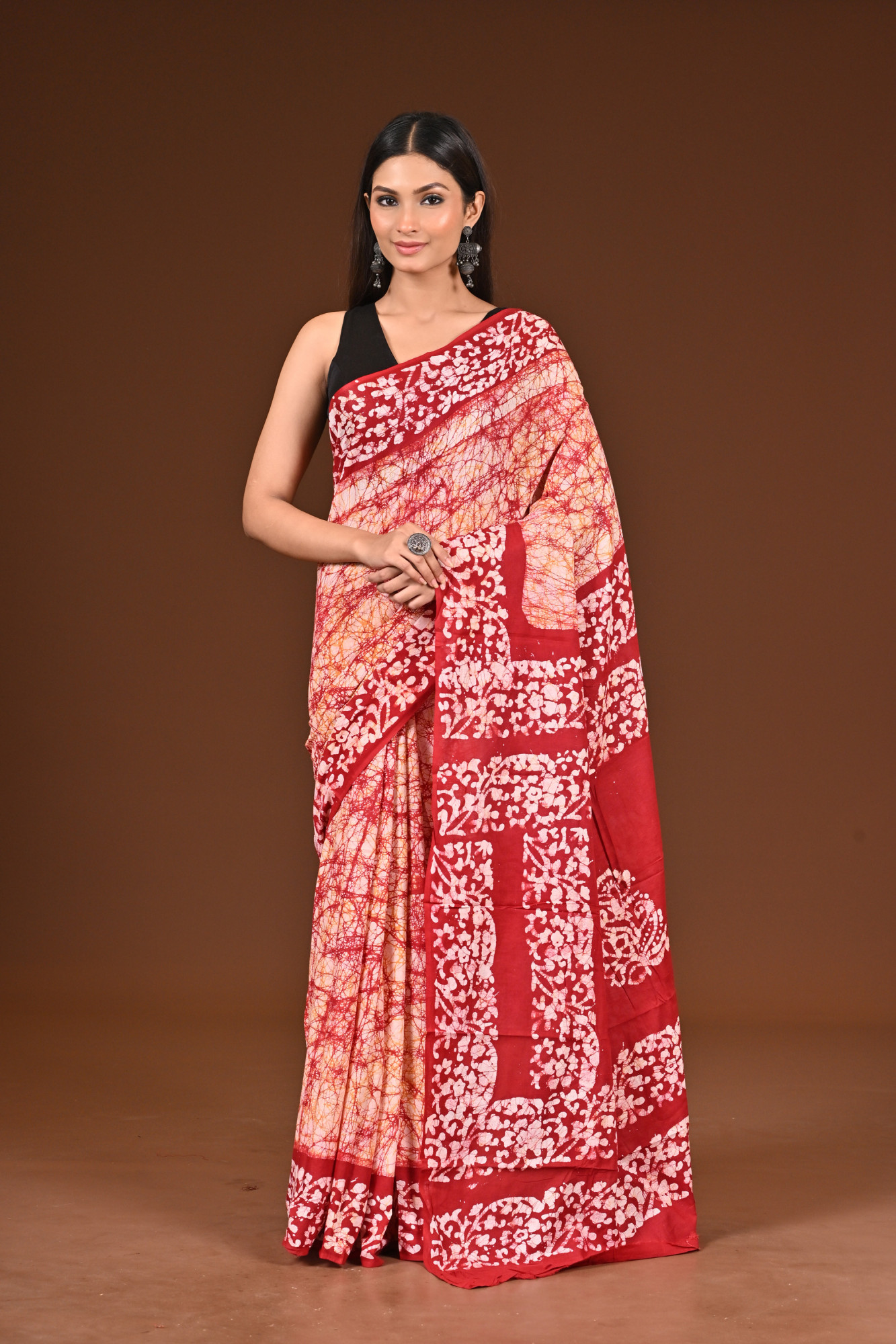 • Zari : A Cotton Hand batik Saree features breathable cotton fabric with traditional hand-dyed Batik patterns. It blends comfort with artistic, intricate designs for a stylish and distinctive appearance.