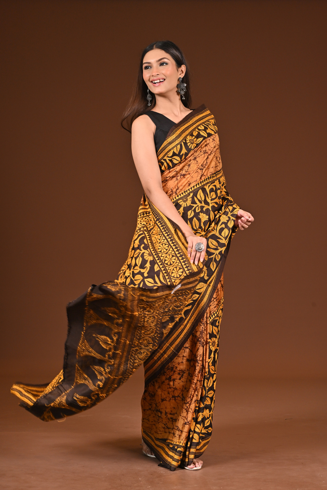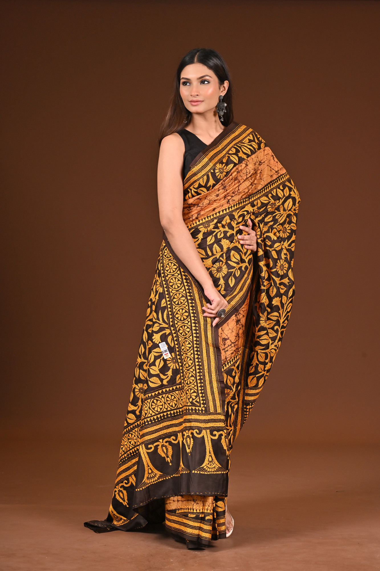 Material : PURE SILK Zari : Experience the elegance of tradition with our Pure Silk Batik Kantha Saree, handcrafted by skilled artisans of Bengal. This saree beautifully blends the art of Batik dyeing with intricate Kantha embroidery, creating a timeless masterpiece. Lightweight, soft, and luxurious, it’s perfect for festive occasions or cultural events. Each piece is unique, reflecting rich craftsmanship and artistic heritage. Inclusion : Comes with a matching blouse piece measuring 100 centimeters. Blouse worn by the model is not included.