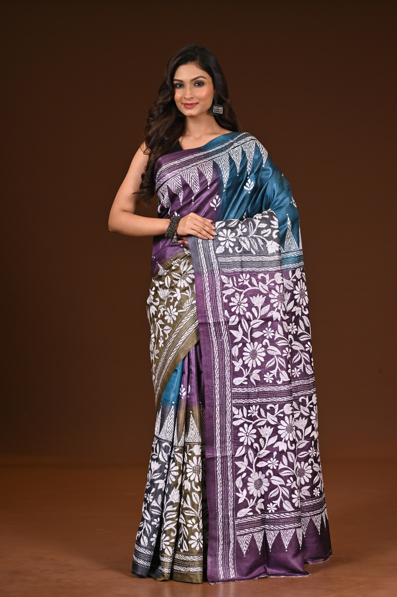 Zari : A pure silk Kantha saree is a luxurious handwoven saree made entirely from high-quality silk, featuring the traditional Kantha embroidery from Bengal. Known for its rich texture and natural sheen, the saree is adorned with intricate, hand-stitched patterns—often floral, folk, or narrative designs—created using fine running stitches. Elegant and timeless, it’s a perfect blend of heritage craftsmanship and sophistication, ideal for special occasions.