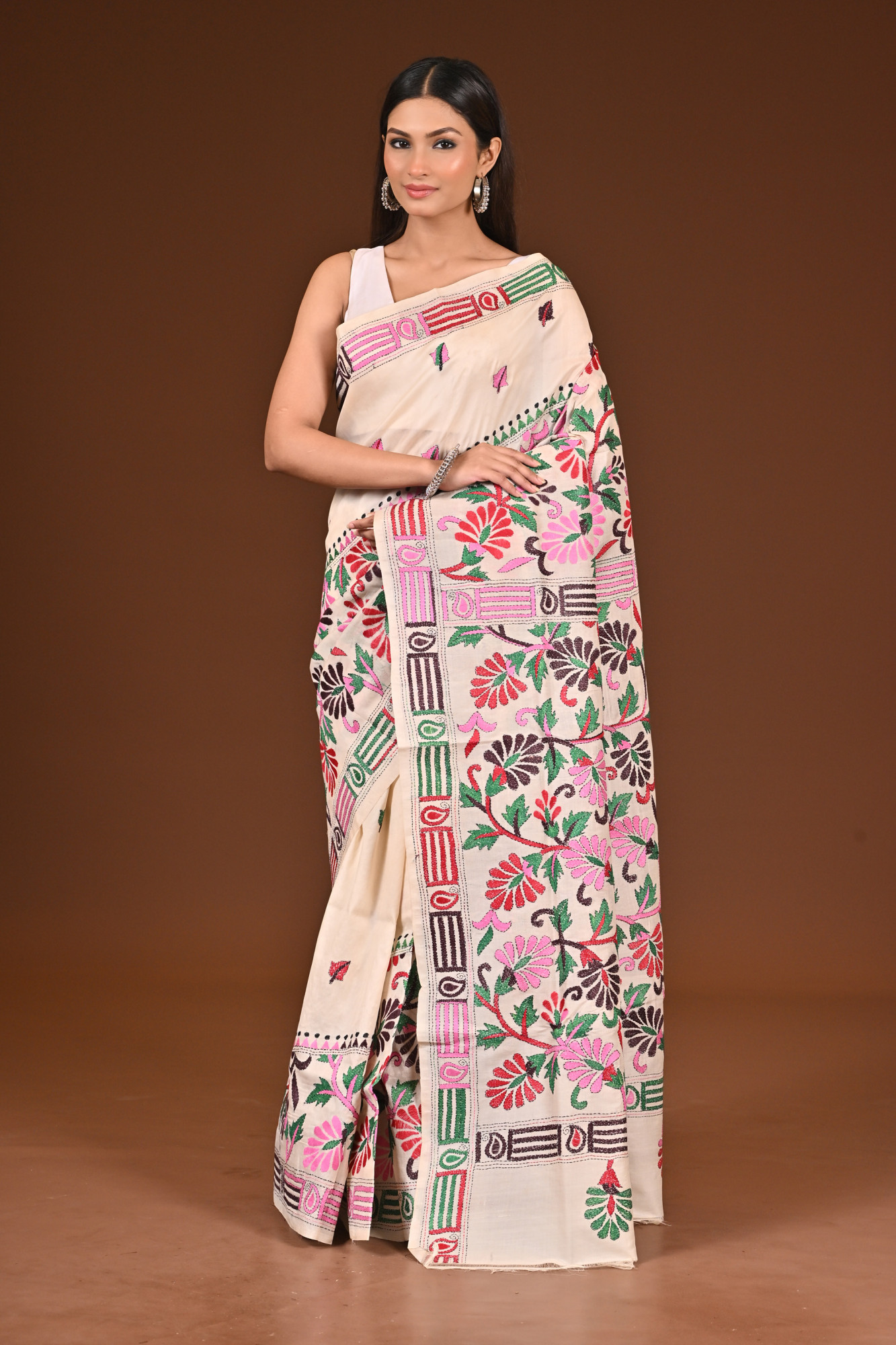 Zari : A pure silk Kantha saree is a luxurious handwoven saree made entirely from high-quality silk, featuring the traditional Kantha embroidery from Bengal. Known for its rich texture and natural sheen, the saree is adorned with intricate, hand-stitched patterns—often floral, folk, or narrative designs—created using fine running stitches. Elegant and timeless, it’s a perfect blend of heritage craftsmanship and sophistication, ideal for special occasions.