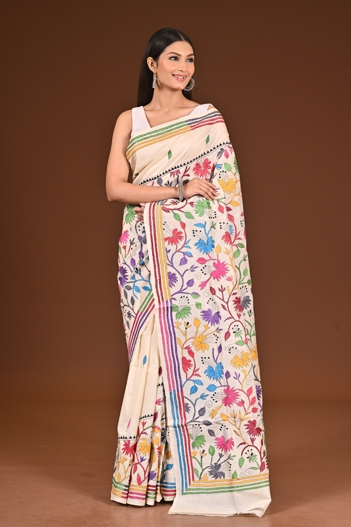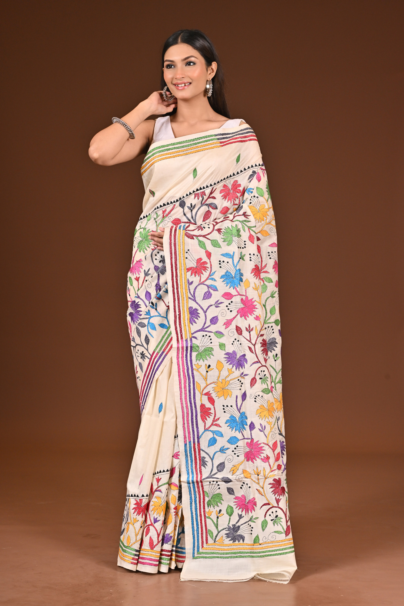 Zari : A pure silk Kantha saree is a luxurious handwoven saree made entirely from high-quality silk, featuring the traditional Kantha embroidery from Bengal. Known for its rich texture and natural sheen, the saree is adorned with intricate, hand-stitched patterns—often floral, folk, or narrative designs—created using fine running stitches. Elegant and timeless, it’s a perfect blend of heritage craftsmanship and sophistication, ideal for special occasions.