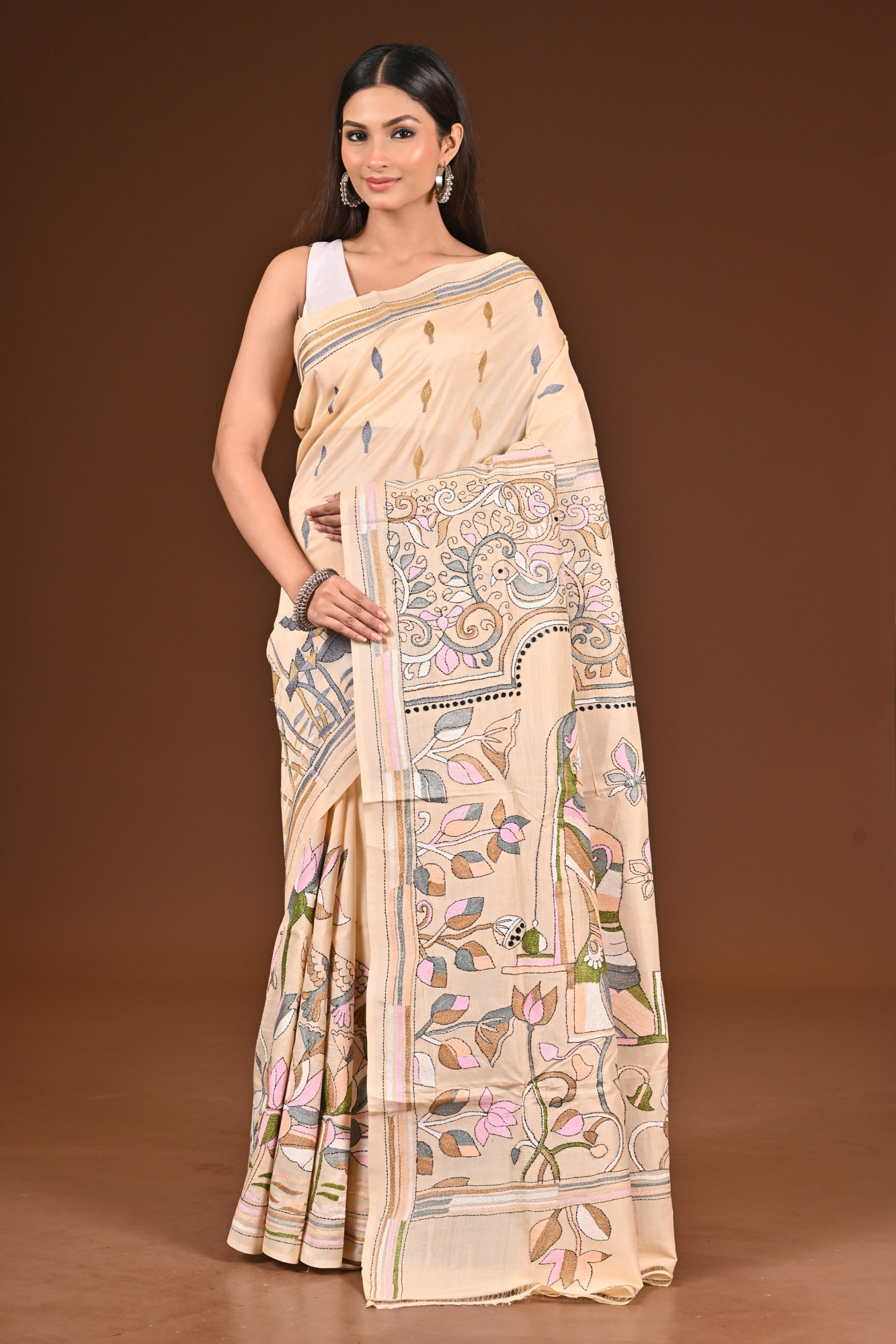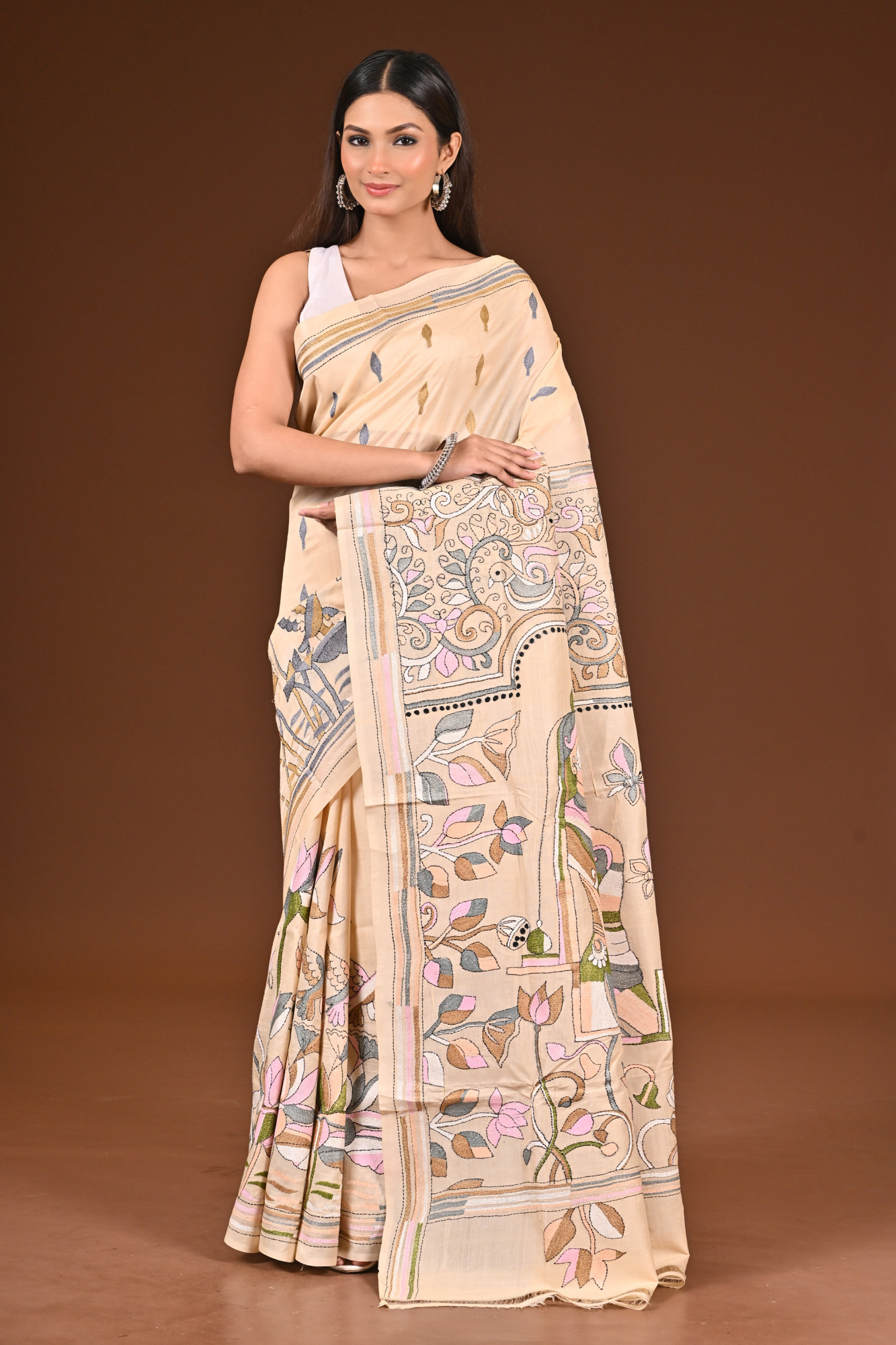 Zari : A pure silk Kantha saree is a luxurious handwoven saree made entirely from high-quality silk, featuring the traditional Kantha embroidery from Bengal. Known for its rich texture and natural sheen, the saree is adorned with intricate, hand-stitched patterns—often floral, folk, or narrative designs—created using fine running stitches. Elegant and timeless, it’s a perfect blend of heritage craftsmanship and sophistication, ideal for special occasions.