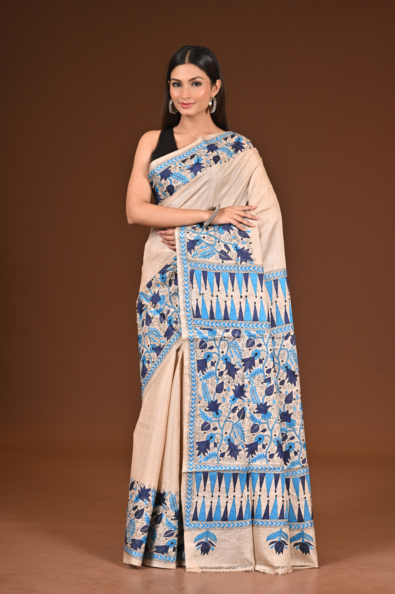 Zari : A pure silk Kantha saree is a luxurious handwoven saree made entirely from high-quality silk, featuring the traditional Kantha embroidery from Bengal. Known for its rich texture and natural sheen, the saree is adorned with intricate, hand-stitched patterns—often floral, folk, or narrative designs—created using fine running stitches. Elegant and timeless, it’s a perfect blend of heritage craftsmanship and sophistication, ideal for special occasions.