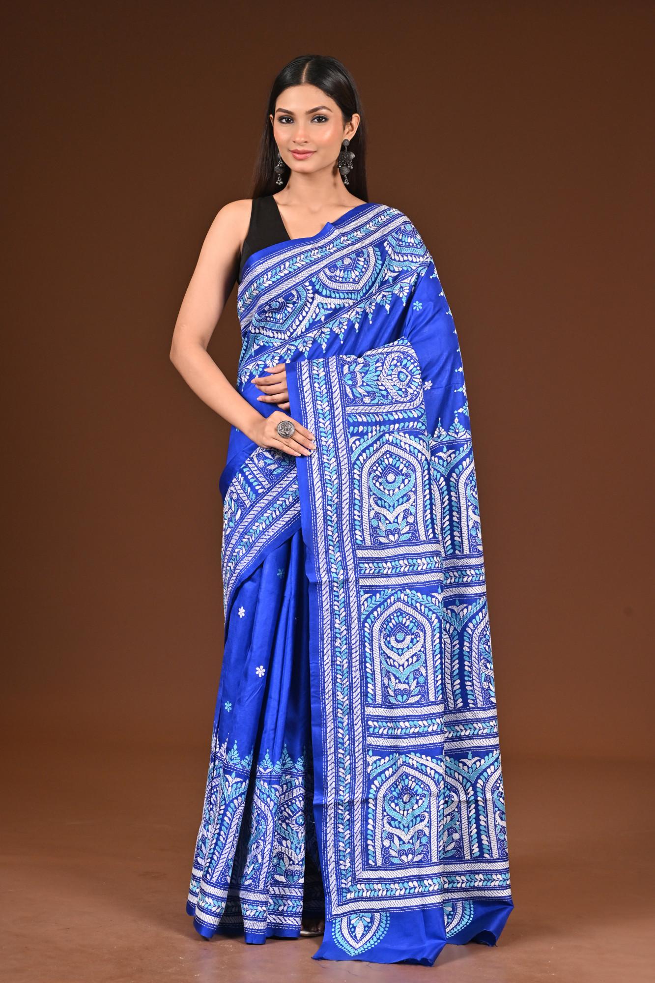 Zari : A pure silk Kantha saree is a luxurious handwoven saree made entirely from high-quality silk, featuring the traditional Kantha embroidery from Bengal. Known for its rich texture and natural sheen, the saree is adorned with intricate, hand-stitched patterns—often floral, folk, or narrative designs—created using fine running stitches. Elegant and timeless, it’s a perfect blend of heritage craftsmanship and sophistication, ideal for special occasions.