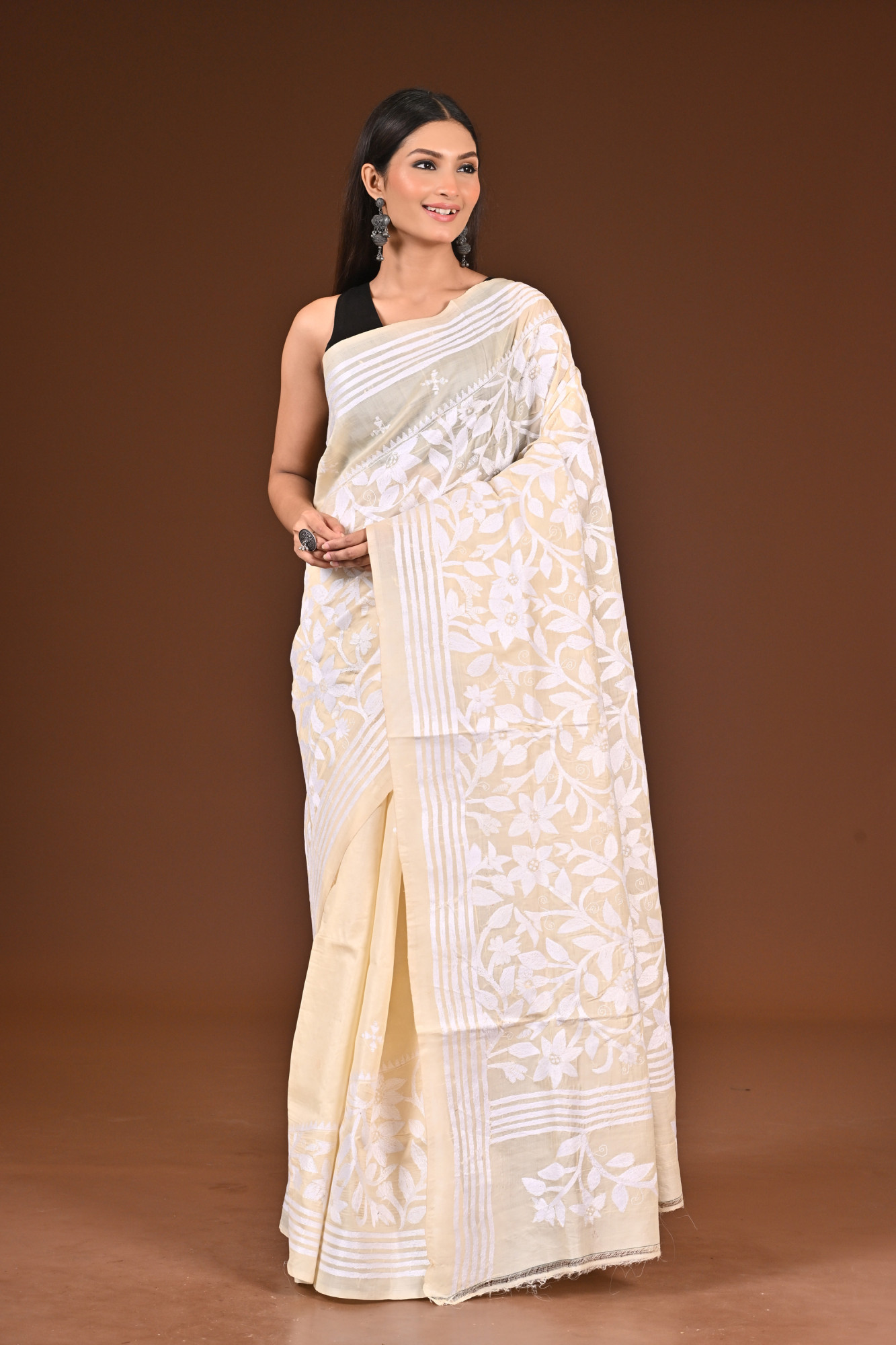 Zari : A pure silk Kantha saree is a luxurious handwoven saree made entirely from high-quality silk, featuring the traditional Kantha embroidery from Bengal. Known for its rich texture and natural sheen, the saree is adorned with intricate, hand-stitched patterns—often floral, folk, or narrative designs—created using fine running stitches. Elegant and timeless, it’s a perfect blend of heritage craftsmanship and sophistication, ideal for special occasions.