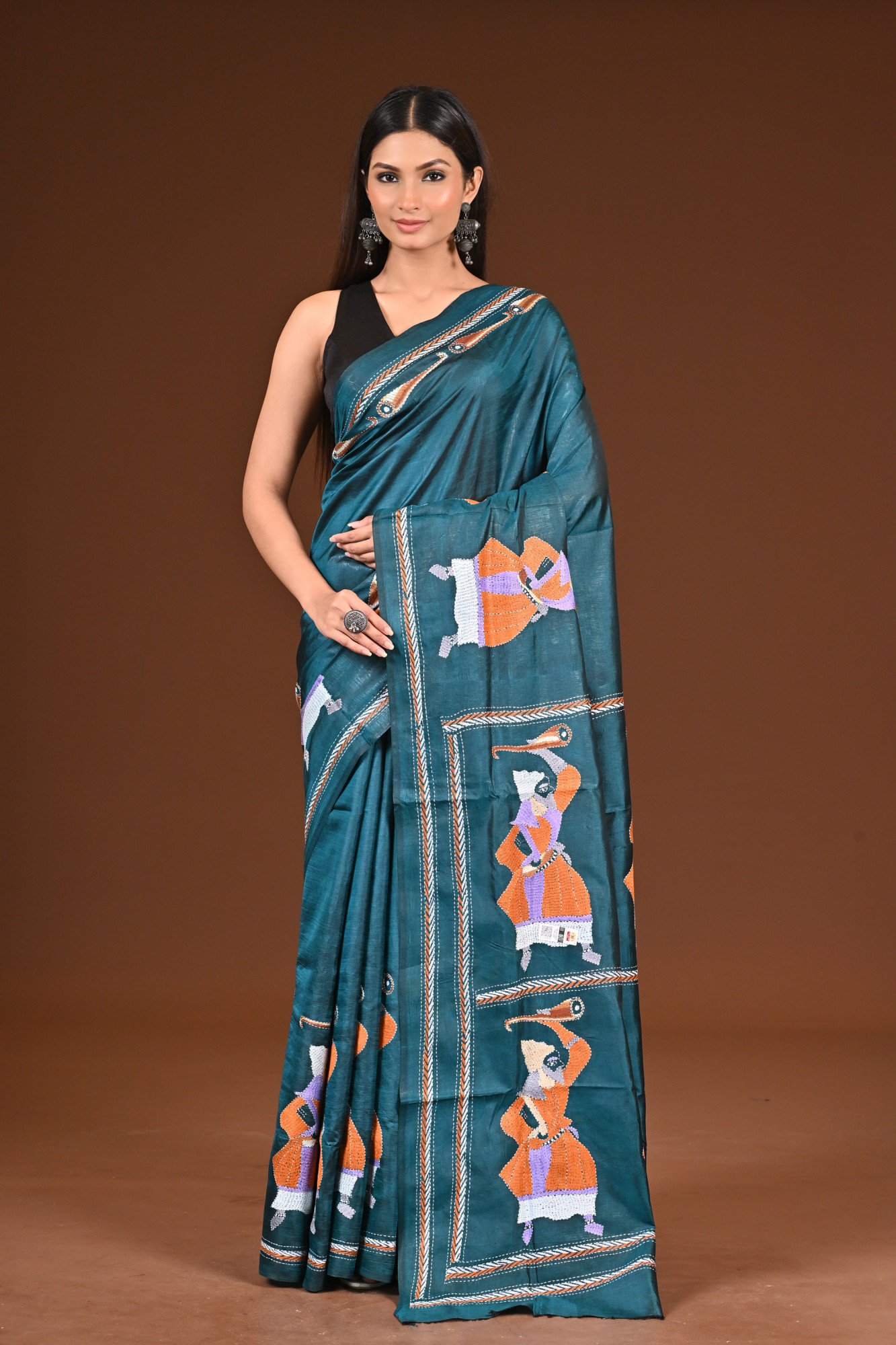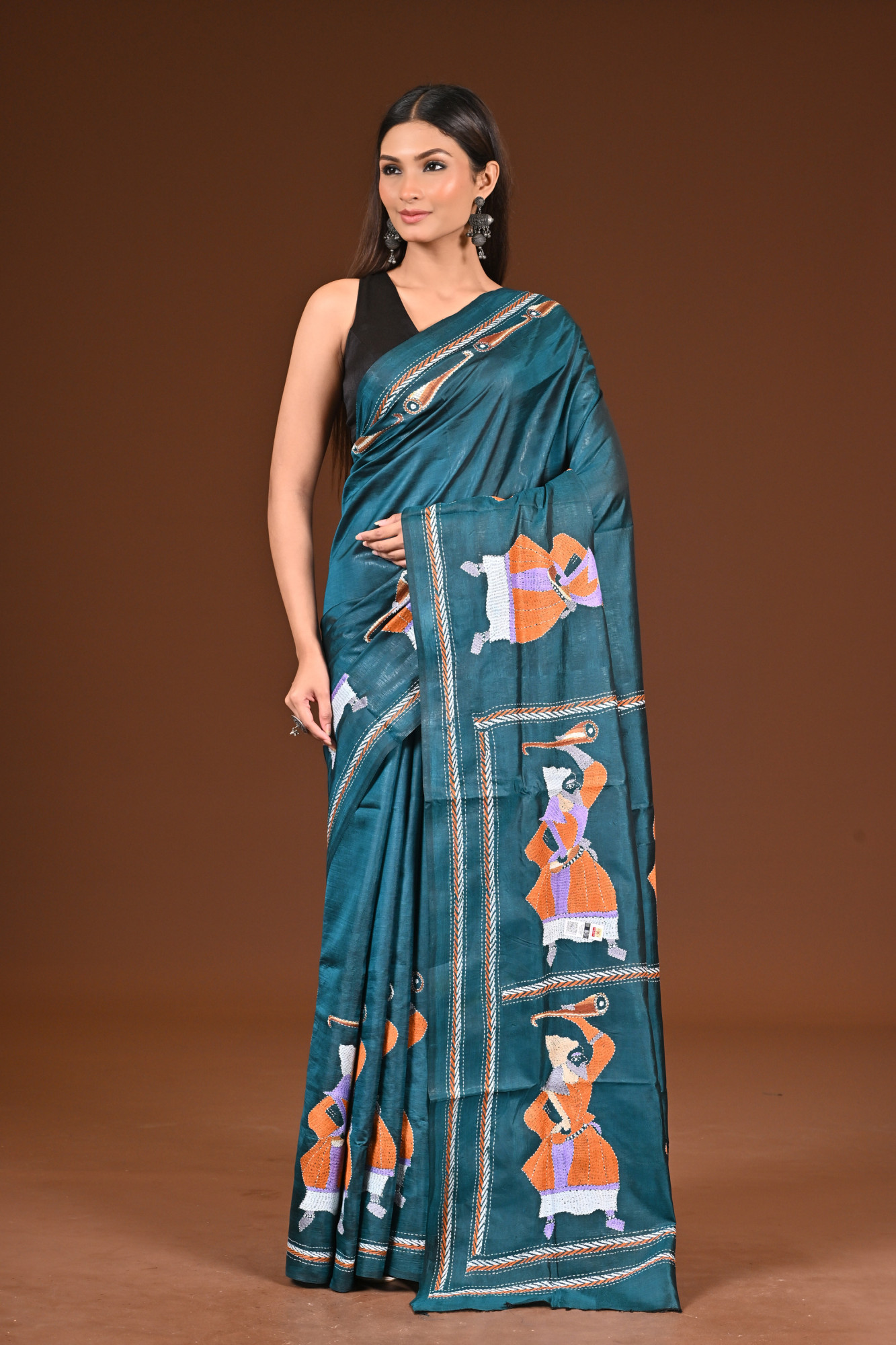 Zari : A pure silk Kantha saree is a luxurious handwoven saree made entirely from high-quality silk, featuring the traditional Kantha embroidery from Bengal. Known for its rich texture and natural sheen, the saree is adorned with intricate, hand-stitched patterns—often floral, folk, or narrative designs—created using fine running stitches. Elegant and timeless, it’s a perfect blend of heritage craftsmanship and sophistication, ideal for special occasions.