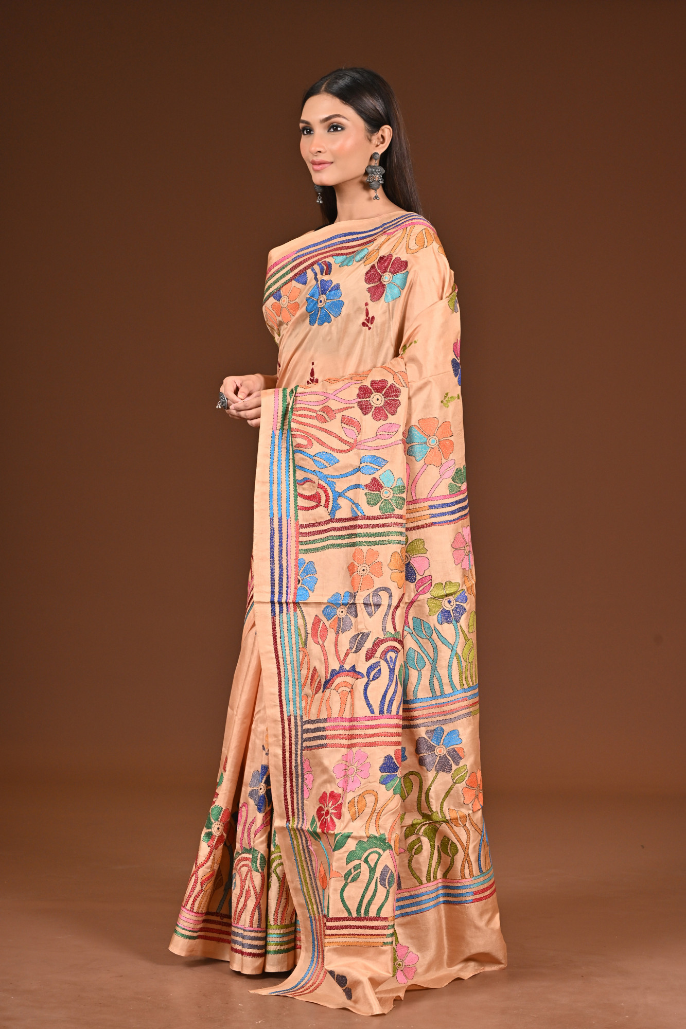 Zari : A pure silk Kantha saree is a luxurious handwoven saree made entirely from high-quality silk, featuring the traditional Kantha embroidery from Bengal. Known for its rich texture and natural sheen, the saree is adorned with intricate, hand-stitched patterns—often floral, folk, or narrative designs—created using fine running stitches. Elegant and timeless, it’s a perfect blend of heritage craftsmanship and sophistication, ideal for special occasions.