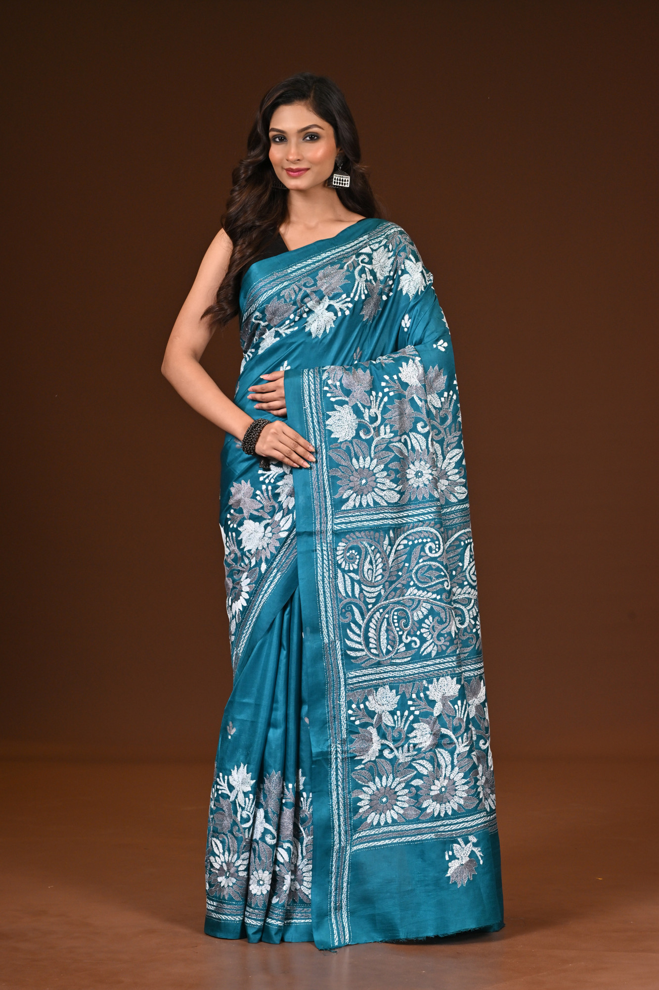 Zari : A pure silk Kantha saree is a luxurious handwoven saree made entirely from high-quality silk, featuring the traditional Kantha embroidery from Bengal. Known for its rich texture and natural sheen, the saree is adorned with intricate, hand-stitched patterns—often floral, folk, or narrative designs—created using fine running stitches. Elegant and timeless, it’s a perfect blend of heritage craftsmanship and sophistication, ideal for special occasions.