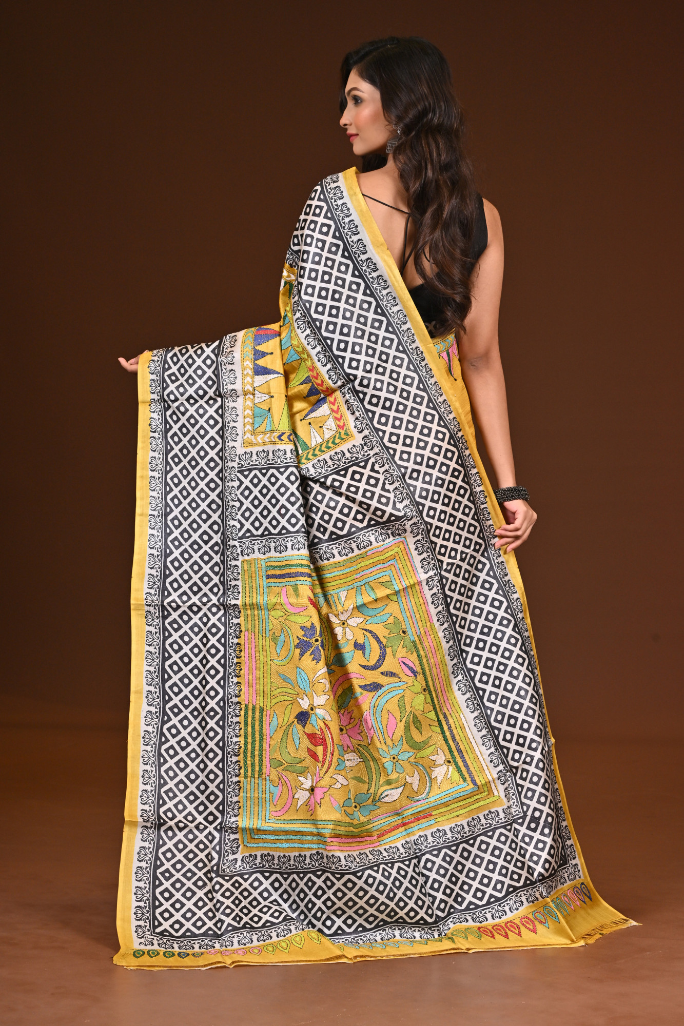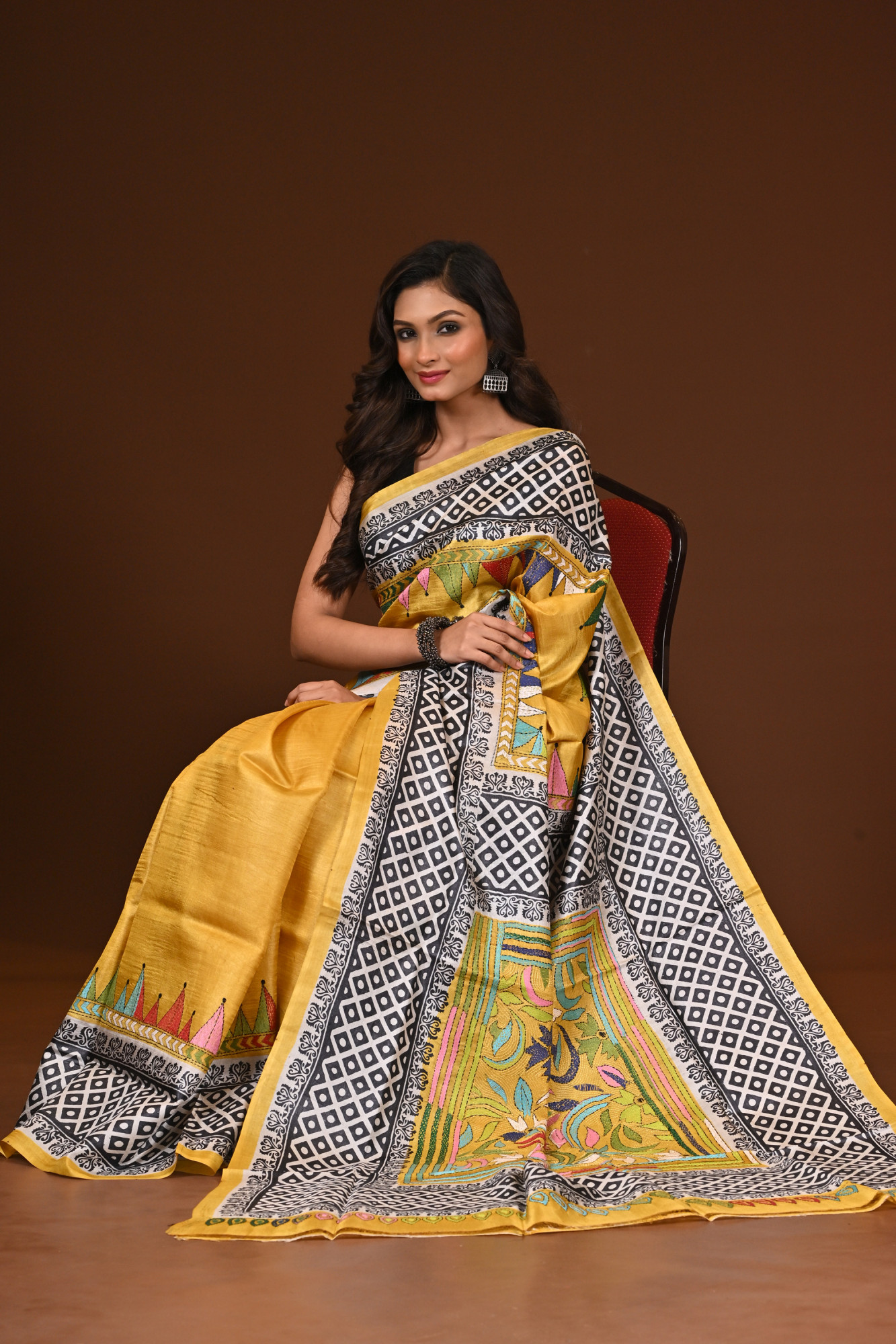 Material : TUSSAR SILK Zari : Experience the timeless charm of tradition with our Tussar Dye Block Kantha Saree, beautifully handcrafted with intricate Kantha stitches and elegant block prints. Made from premium Tussar silk, this saree blends natural texture with artistic craftsmanship, offering a perfect balance of grace and sophistication. Ideal for festive occasions and cultural gatherings, it brings out the beauty of Bengal’s heritage in every drape. Inclusion : Comes with a matching blouse piece measuring 100 centimeters. Blouse worn by the model is not included.