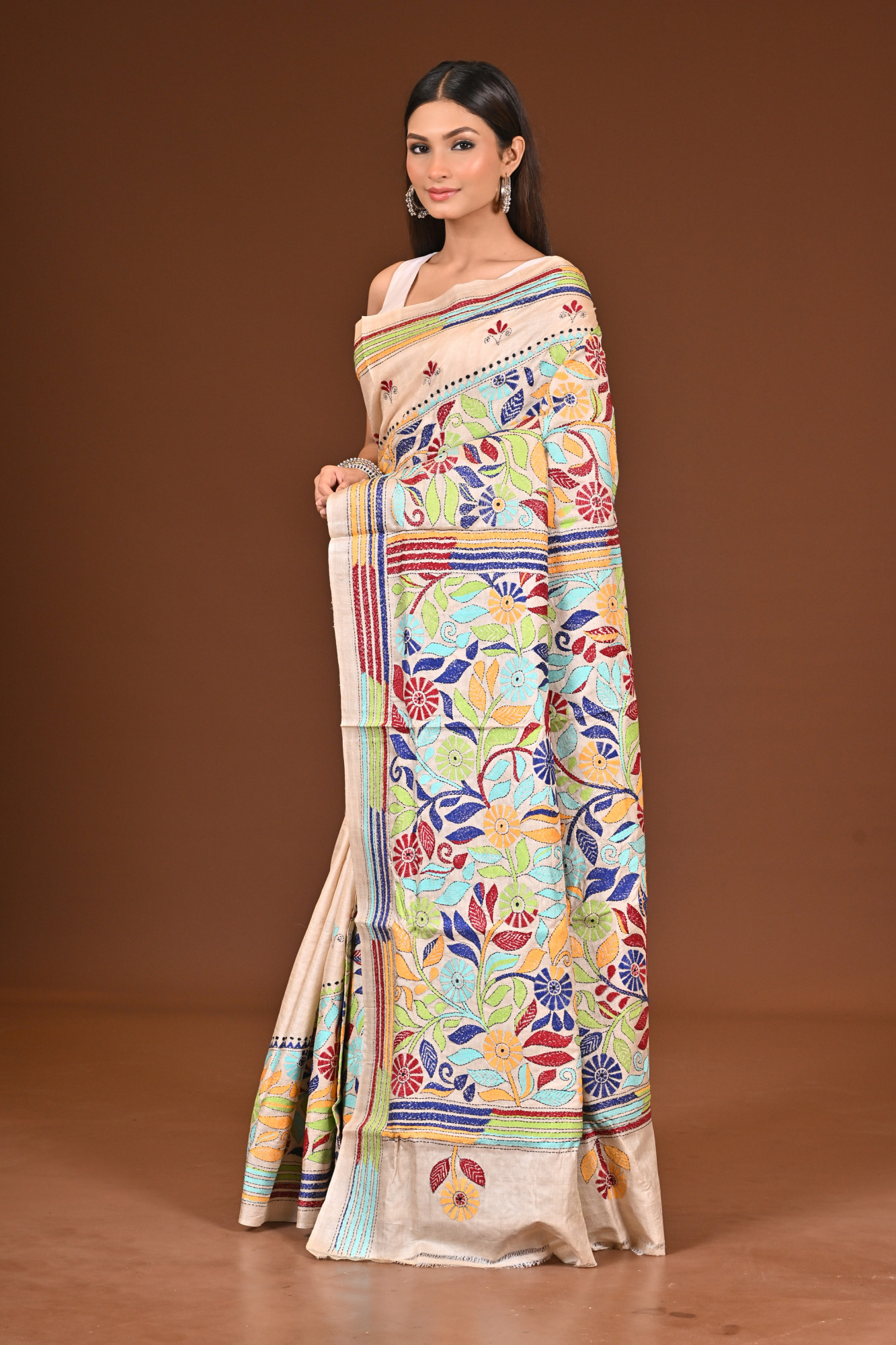 Material : Tussar Silk Zari : A Tussar Silk Kantha Saree is a traditional Indian saree crafted from Tussar silk, known for its rich texture and natural gold sheen. It features Kantha embroidery, a hand-stitched technique originating from Bengal, where intricate patterns—often floral, paisley, or folk motifs—are created using simple running stitches. This saree beautifully blends rustic elegance with artisanal charm, making it a timeless choice for both casual and festive occasions. Inclusion : Comes with a matching blouse piece measuring 100 centimeters. Blouse worn by the model is not included. Care Tips: Dry clean only to maintain embroidery and fabric texture. Store in a muslin cloth to avoid snagging. Iron on low heat from the reverse side. Avoid direct perfume contact with the embroidery. Refold occasionally to preserve fabric structure. Note: This is a handmade/ handwoven product. So, any minor inconsistency in weaving/ embroidery are natural and lend to the individuality of the product. Every possible care has been taken to give an accurate representation of the product. However minor variation occurs due to digital photography/ lighting/ brightness settings of mobile, tablet, laptop, etc. which is beyond our hands.