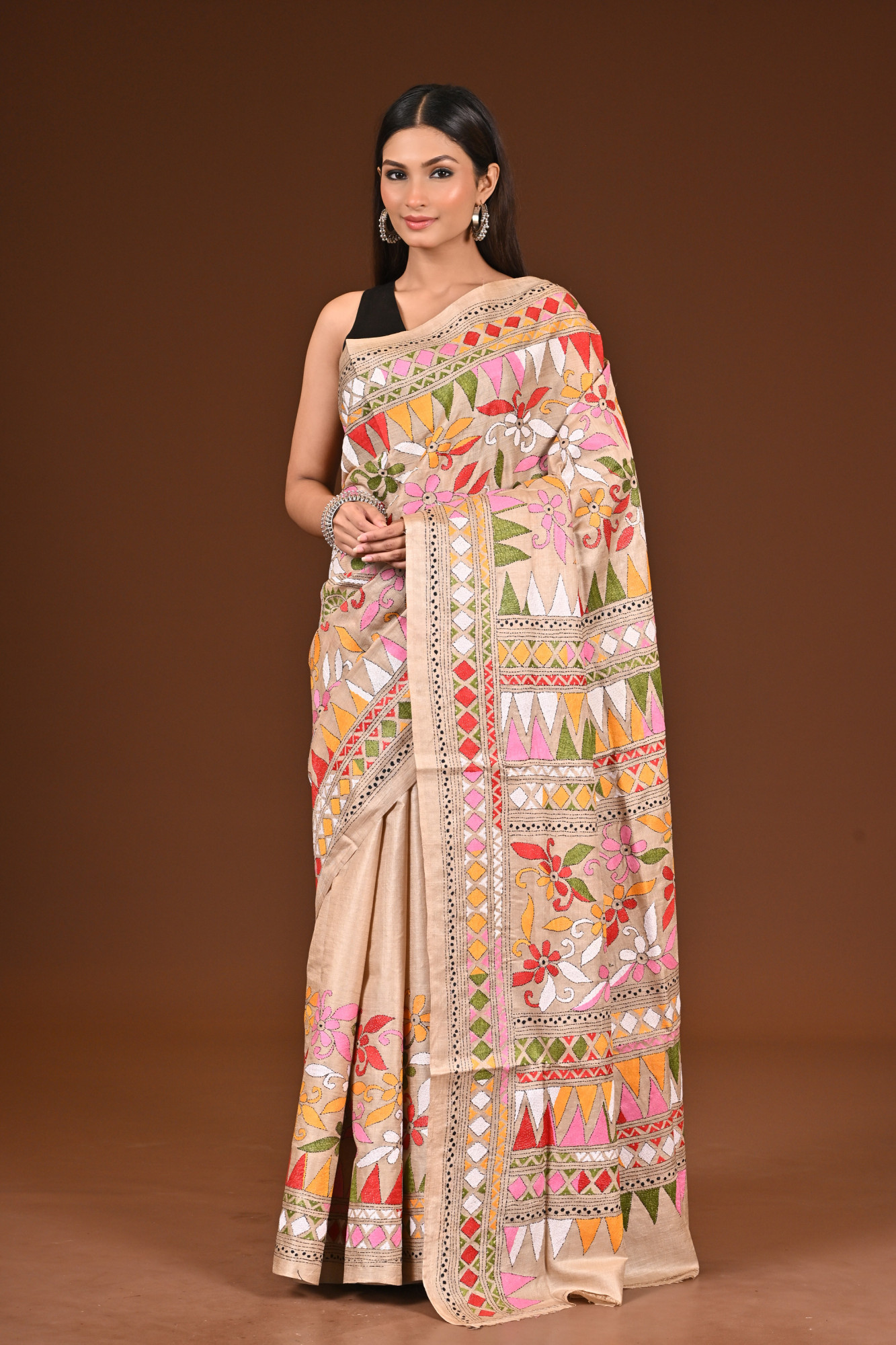 Material : Tussar Silk Zari : A Tussar Silk Kantha Saree is a traditional Indian saree crafted from Tussar silk, known for its rich texture and natural gold sheen. It features Kantha embroidery, a hand-stitched technique originating from Bengal, where intricate patterns—often floral, paisley, or folk motifs—are created using simple running stitches. This saree beautifully blends rustic elegance with artisanal charm, making it a timeless choice for both casual and festive occasions. Inclusion : Comes with a matching blouse piece measuring 100 centimeters. Blouse worn by the model is not included. Care Tips: Dry clean only to maintain embroidery and fabric texture. Store in a muslin cloth to avoid snagging. Iron on low heat from the reverse side. Avoid direct perfume contact with the embroidery. Refold occasionally to preserve fabric structure. Note: This is a handmade/ handwoven product. So, any minor inconsistency in weaving/ embroidery are natural and lend to the individuality of the product. Every possible care has been taken to give an accurate representation of the product. However minor variation occurs due to digital photography/ lighting/ brightness settings of mobile, tablet, laptop, etc. which is beyond our hands.