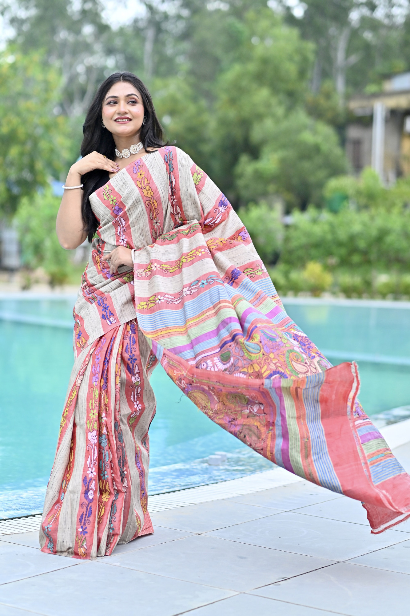 Zari : The Ghicha Stripe Kantha Saree is a traditional Indian saree that blends Ghicha silk—a type of hand-reeled silk known for its natural sheen and texture—with the intricate Kantha embroidery from Bengal. This saree features striped patterns and is hand-stitched with detailed Kantha work, often depicting floral, geometric, or folk motifs. Lightweight yet elegant, it's perfect for both festive occasions and artistic, everyday wear.