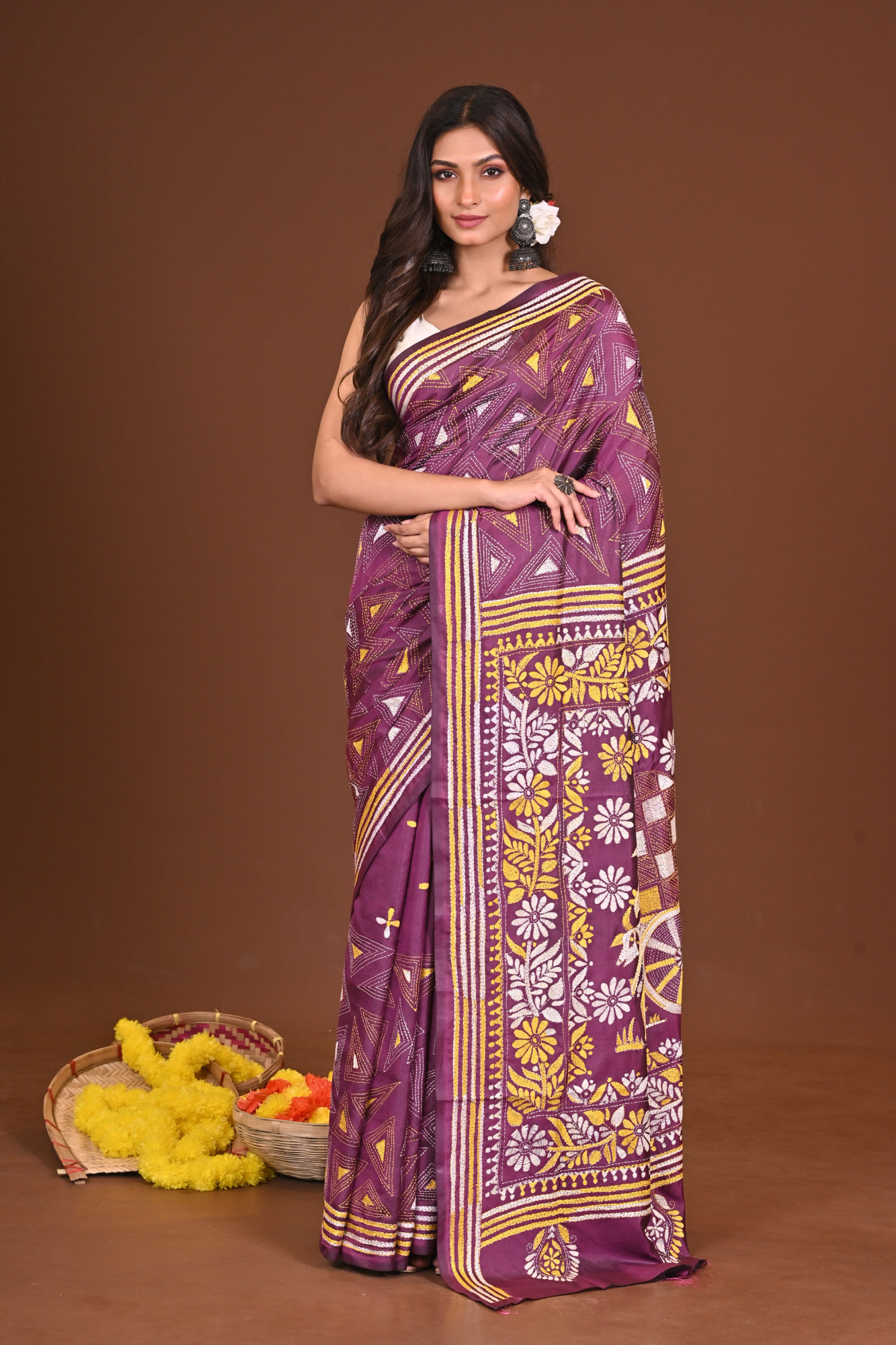 Zari : A blended silk Kantha saree is a traditional Indian saree crafted from a mix of silk and other fibers, adorned with Kantha embroidery—a hand-stitched technique originating from Bengal. These sarees are known for their lightweight drape, smooth texture, and intricate, often storytelling motifs stitched in fine running stitches. The blend of silk gives it a soft sheen and elegance, making it a perfect choice for both festive and casual occasions.