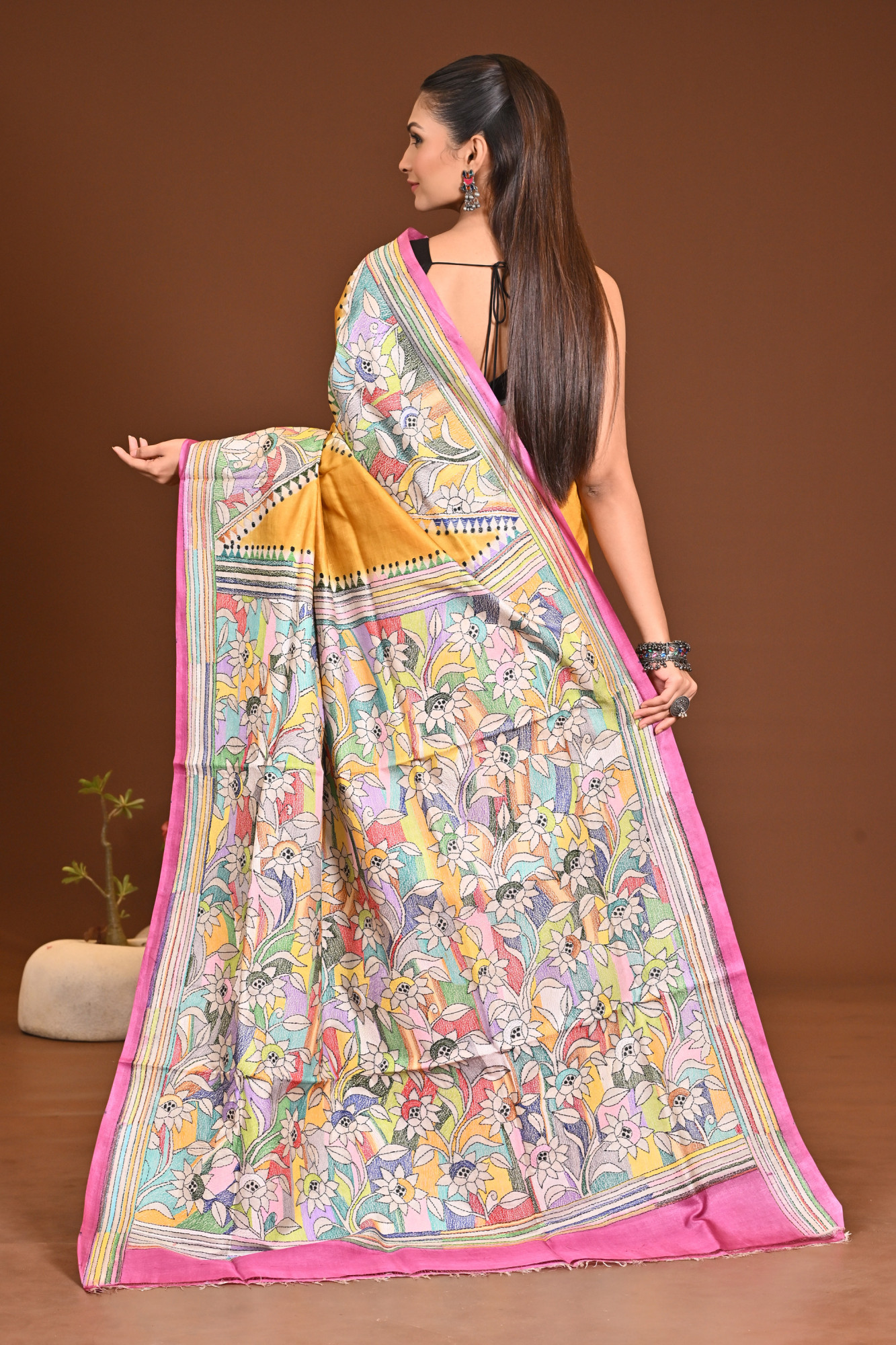 Zari : A vibrant Tossor silk saree featuring unique dye collage artistry, blending multiple hues and patterns for a contemporary yet traditional look. Lightweight, textured, and visually striking—perfect for artistic and elegant styling.