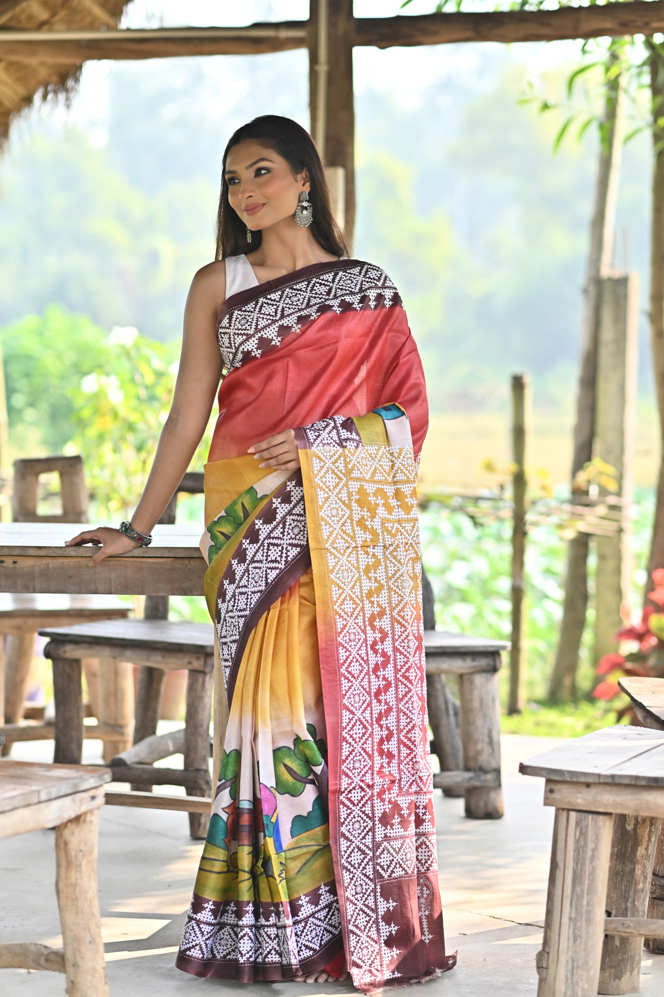 Zari : A Tussar Fusion Kantha Saree blends the rich, natural sheen of Tussar silk with the intricate charm of traditional Kantha hand-embroidered stitches, creating a lightweight, elegant drape that beautifully merges heritage craftsmanship with contemporary design for both festive and semi-formal occasions.