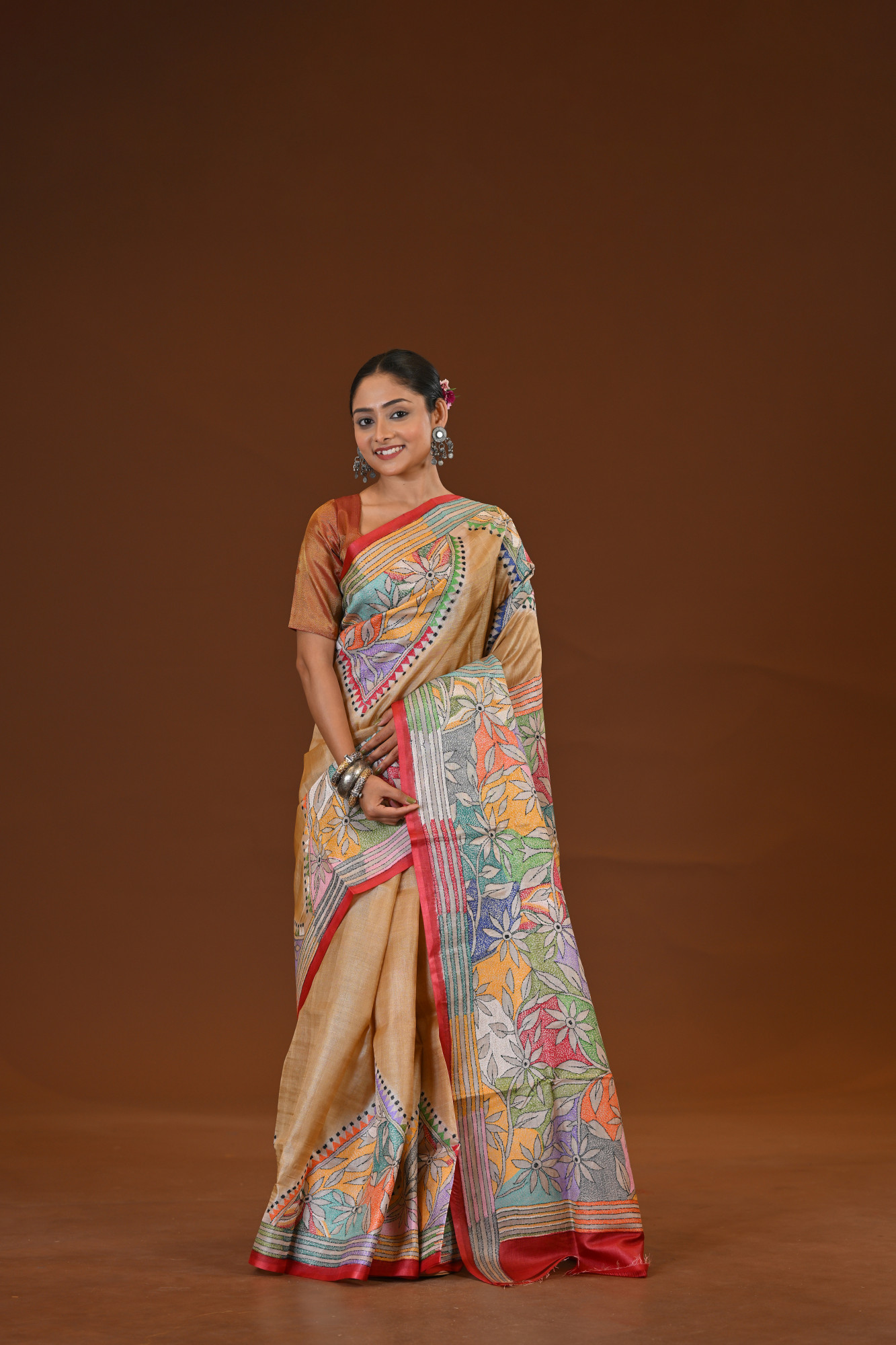 Zari : A Tussar Diy College Saree is a beautifully crafted saree made from natural Tussar silk, prized for its textured feel and subtle golden sheen. It features hand-printed designs, often inspired by nature, traditional art, or tribal motifs. Lightweight and breathable, this saree combines elegance with earthy charm, making it perfect for both everyday grace and special occasions.