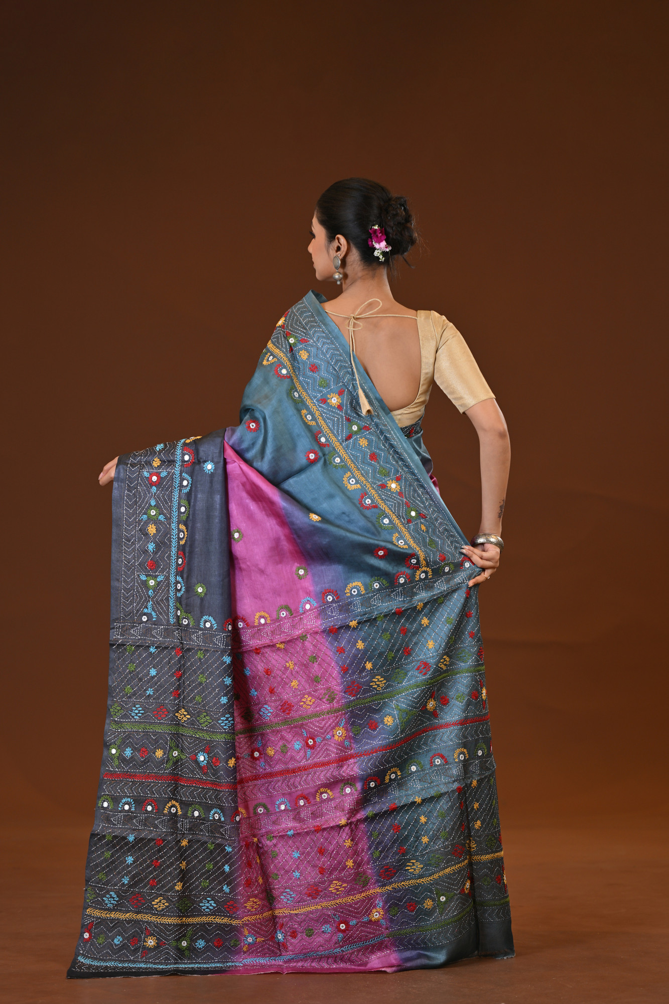 Zari : A Tussar Diy Lambani Saree is a beautifully crafted saree made from natural Tussar silk, prized for its textured feel and subtle golden sheen. It features hand-printed designs, often inspired by nature, traditional art, or tribal motifs. Lightweight and breathable, this saree combines elegance with earthy charm, making it perfect for both everyday grace and special occasions.