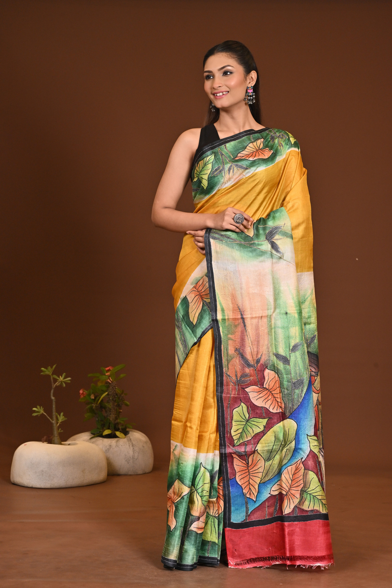 • Zari : A Tussar Handprint Kantha Saree features luxurious Tussar silk adorned with hand-printed designs and intricate Kantha embroidery. This saree blends the rich texture of Tussar silk with artisanal handwork for a sophisticated and unique look.