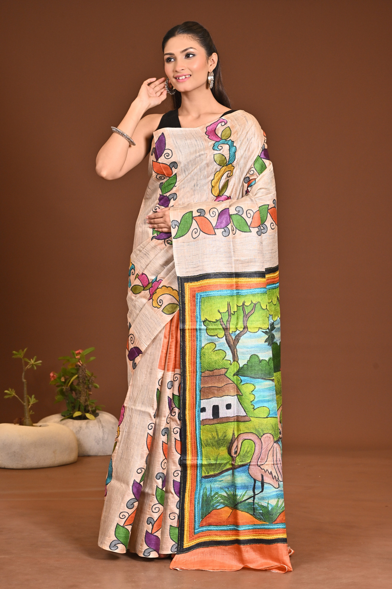 Zari : This Tussar Silk Hand Print Saree showcases the natural beauty of rich Tussar silk enhanced with exquisite hand-printed motifs. Its textured feel, soft sheen, and artistic patterns create a perfect blend of tradition and contemporary style. Lightweight and graceful, the saree drapes beautifully—making it ideal for festive occasions, cultural events, or elegant everyday wear. A timeless piece for those who appreciate handcrafted artistry.