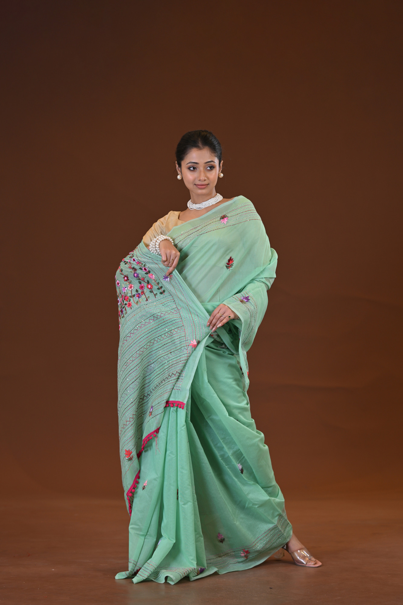 Zari : A Tussar Silk Kantha Stitch Saree is a beautifully crafted saree made from natural Tussar silk, prized for its textured feel and subtle golden sheen. It features hand-printed designs, often inspired by nature, traditional art, or tribal motifs. Lightweight and breathable, this saree combines elegance with earthy charm, making it perfect for both everyday grace and special occasions.