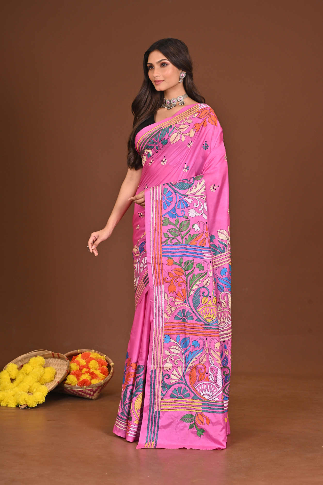 Zari : A blended silk Kantha saree is a traditional Indian saree crafted from a mix of silk and other fibers, adorned with Kantha embroidery—a hand-stitched technique originating from Bengal. These sarees are known for their lightweight drape, smooth texture, and intricate, often storytelling motifs stitched in fine running stitches. The blend of silk gives it a soft sheen and elegance, making it a perfect choice for both festive and casual occasions.